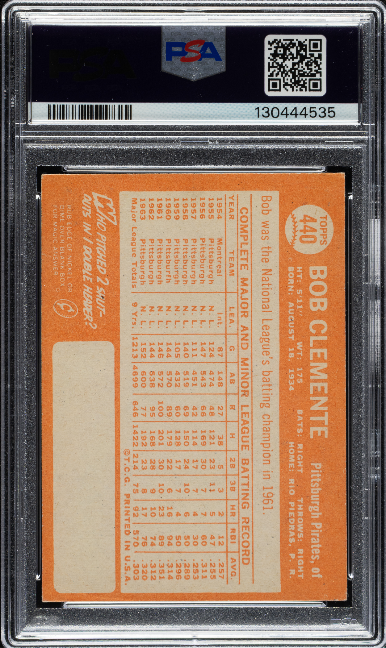 Lot # 1978: 1964 Topps #440 Roberto Clemente PSA VG 3