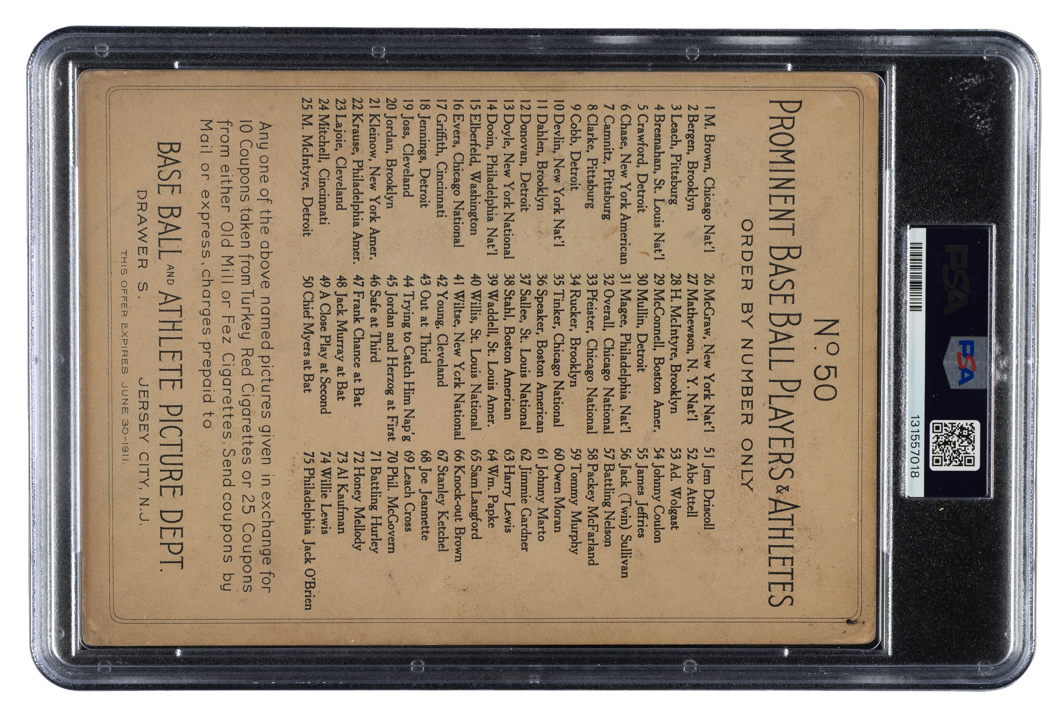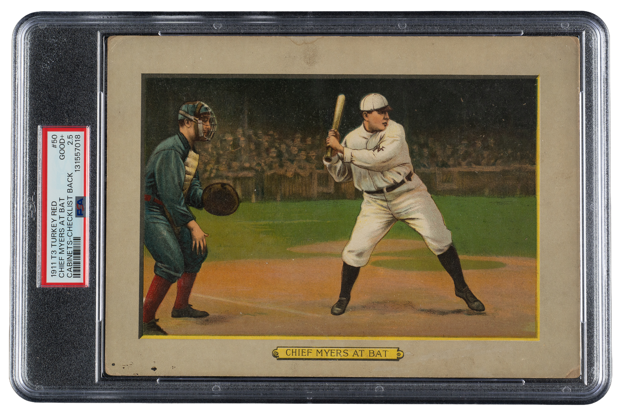 Lot # 835: 1911 T3 Turkey Red #50 Chief Myers At Bat PSA GOOD+ 2.5