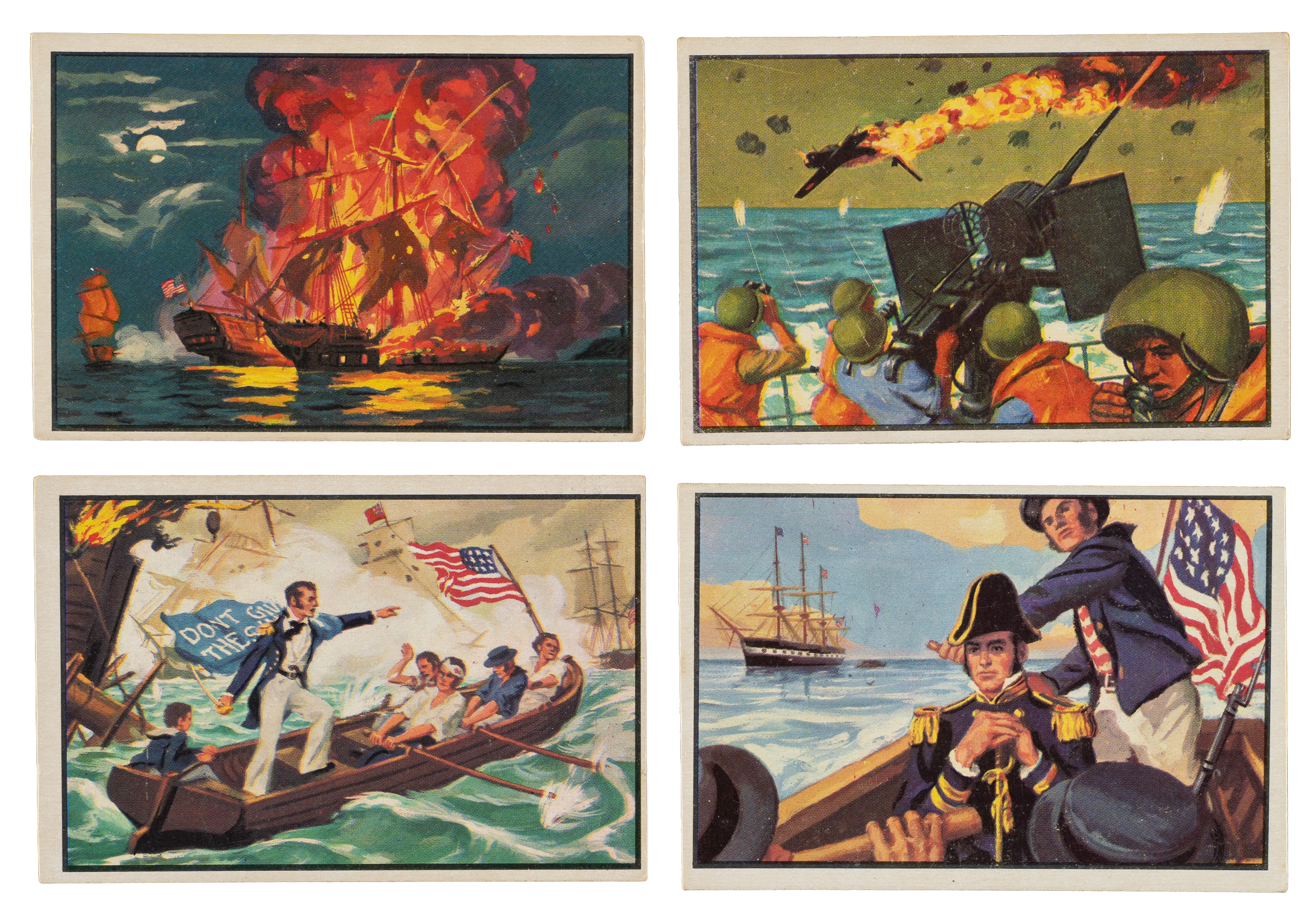Presented is a complete 48-card set of 1954 Bowman "U.S. Navy Victories" trading cards. Condition is 16% Ex to Ex-Mt (including one Nr/Mt) and 84% Vg to Vg-Ex (including a couple lesser). This is an incredibly popular set among nonsport collectors for its brilliant illustrations and historical content. This is a very attractive, mostly mid-grade complete set. Total: 48 cards. The size/weight of this item requires that there will be an additional shipping charge for this lot.