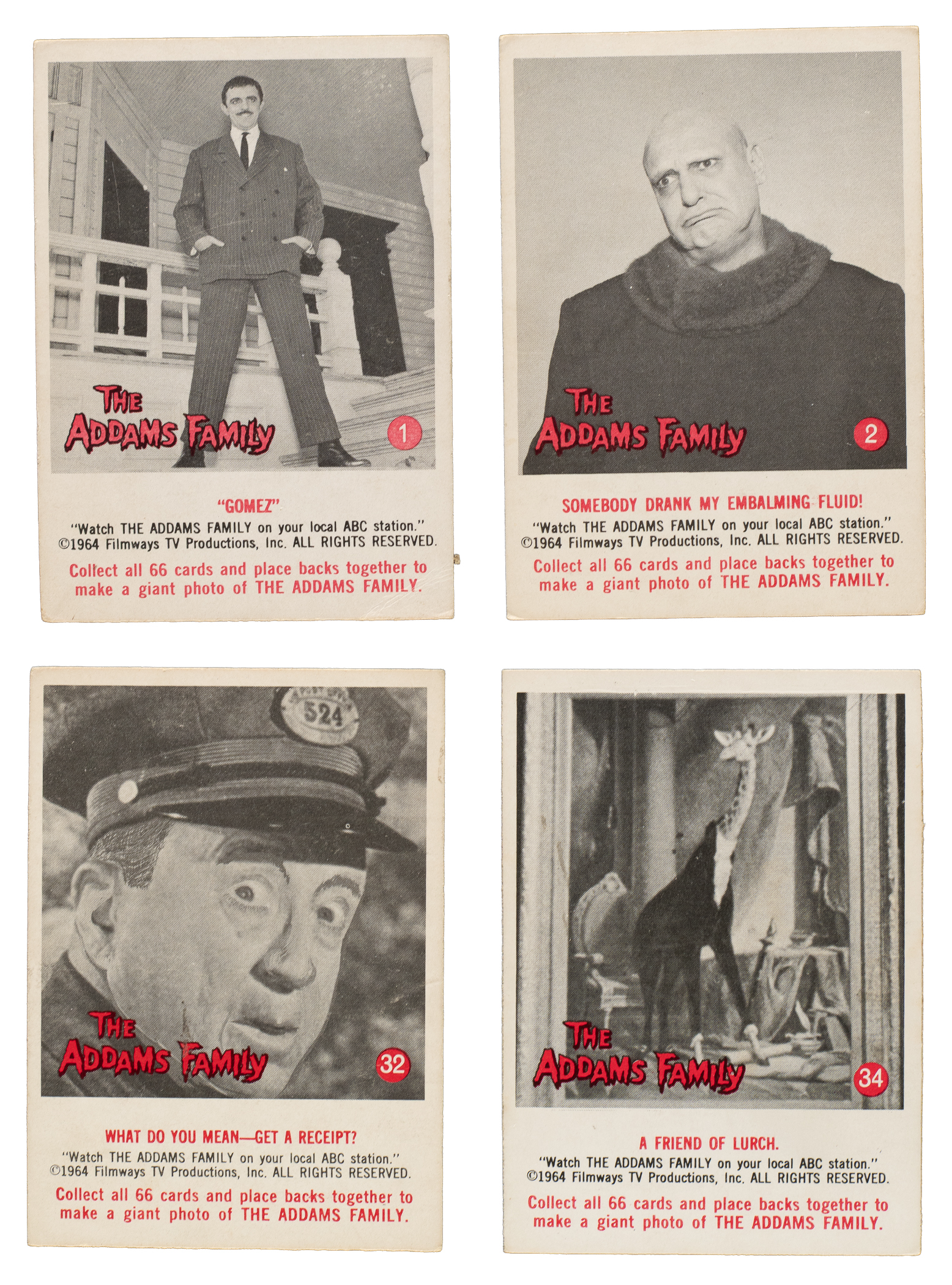 Complete 66-card set of 1964 Donruss "The Addams Family" trading cards. Condition is Vg to Vg-Ex overall, with a couple Ex and 10% lesser. Total: 66 cards. The size/weight of this item requires that there will be an additional shipping charge for this lot.