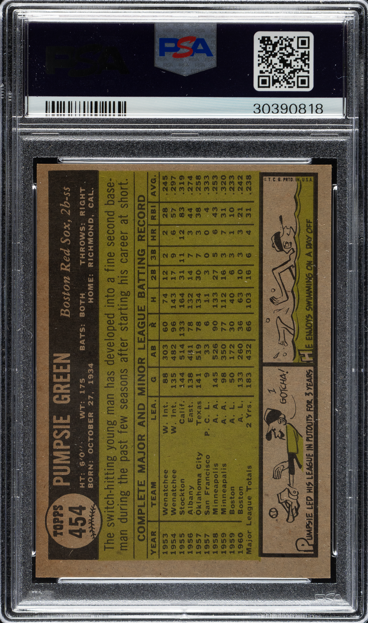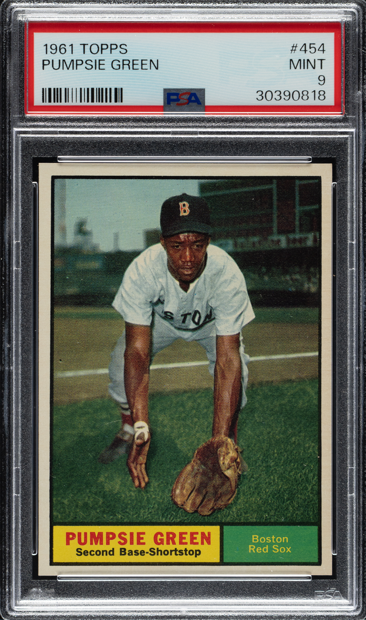 Graded MINT 9 by PSA. Boston Red Sox. Only two examples graded higher by PSA. Pumpsie Green was the first Black player to play for the Boston Red Sox. He made his debut in 1959 as a pinch-runner, making the Red Sox the last team to integrate in major league baseball.