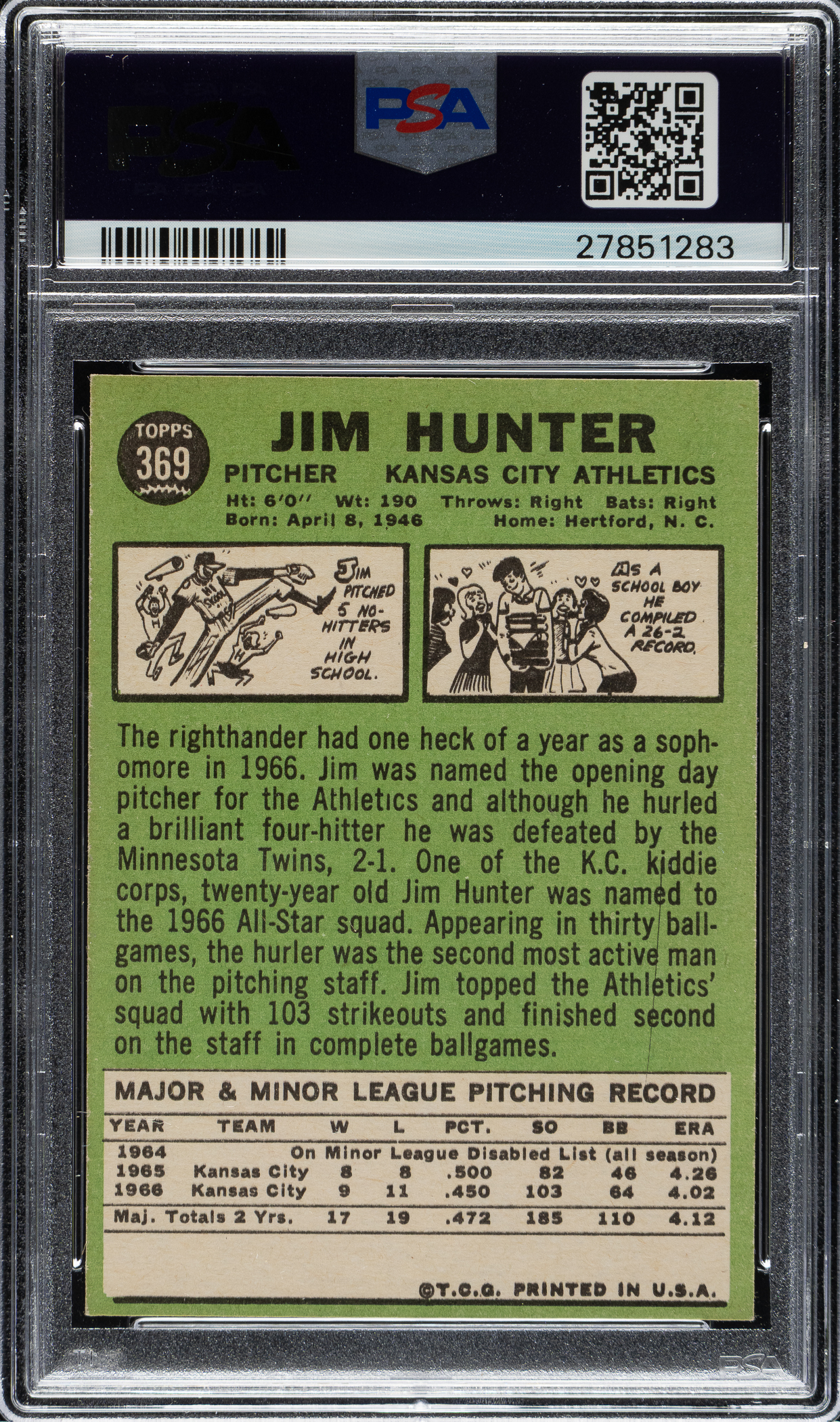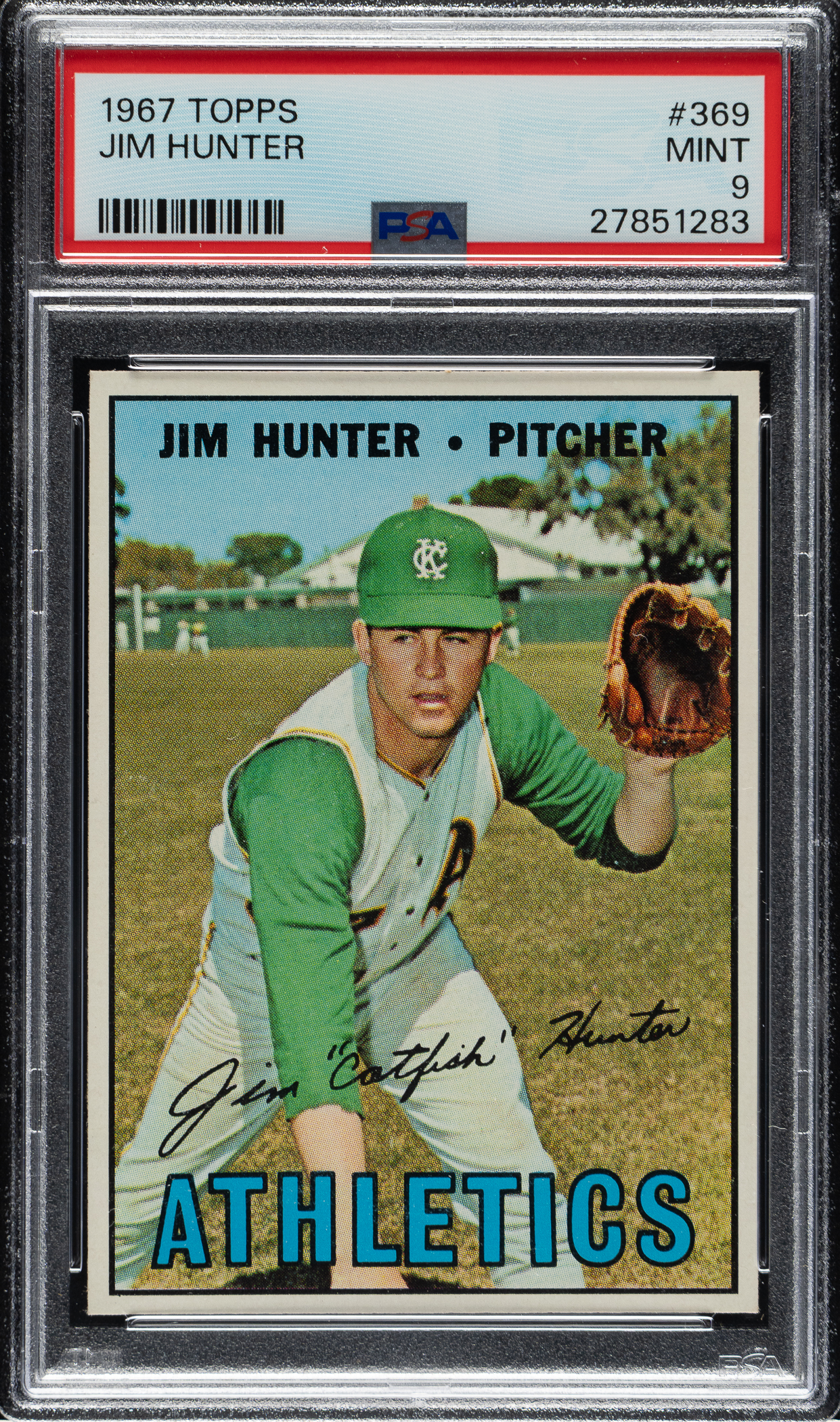 Graded MINT 9 by PSA. Kansas City Athletics Hall of Famer Jim "Catfish" Hunter. Only six examples graded higher by PSA.