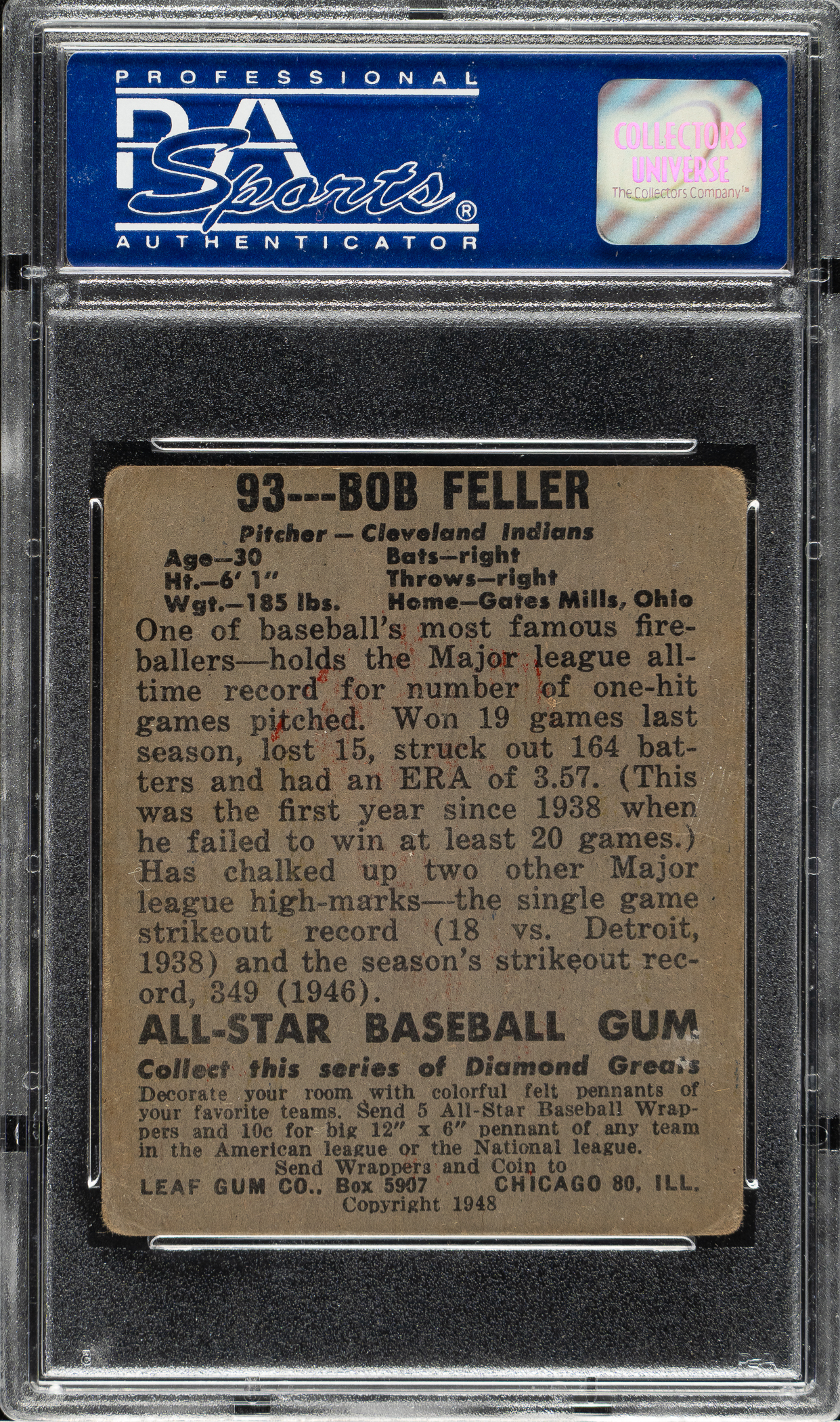 Graded GOOD 2 by PSA. Pleasing example of 1948-1949 Leaf #93 Bob Feller. Feller’s Leaf card is one of the scarcest and most significant of all postwar baseball cards. Chicago's Leaf Gum Company produced the first multicolor baseball cards of the post-World War II era in 1948-1949. Forty-nine cards in the set are considered "standard" and the additional "short print" series of 49 cards in the set are so rare that "Rare Leafs" has long been a formal card-collecting hobby term. Leafs are, without question, one of the toughest postwar sets to complete because of all the rare cards. Feller is not only one of the keys to this rare series, he is also one of the keys to the 1948-1949 Leaf set. The offered example has bold colors and outstanding registration. Moderate corner wear and scattered creasing are largely responsible for the assigned grade.