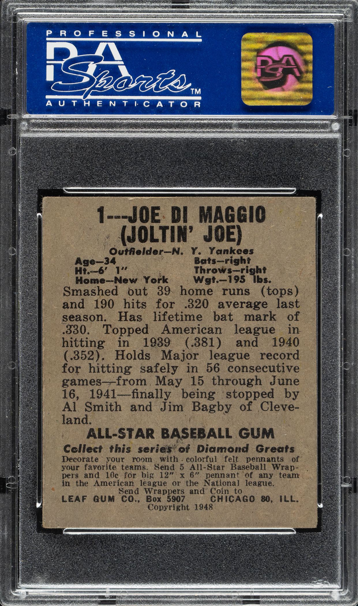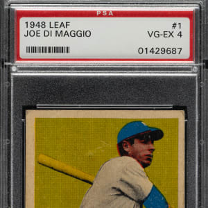 Graded VG-EX 4 by PSA. Very attractive mid-grade example of this significant condition rarity that is also one of New York Yankees Hall of Famer Joe DiMaggio’s most popular cards. Considering the fragile cardboard used in the production of the 1948-1949 Leaf issue and the excessive wear the No. 1 card is subjected to, the visual appeal of this card is all the more impressive. This is also DiMaggio's only postwar bubble-gum card issued during his playing days (he did not allow cards of himself to be printed by Topps or Bowman), giving it even greater significance. The offered example has bright colors, a crisp image, and honest corner wear. Clean, boldly printed reverse displaying a few small wrinkles in the lower portion. This is a solid mid-grade example.