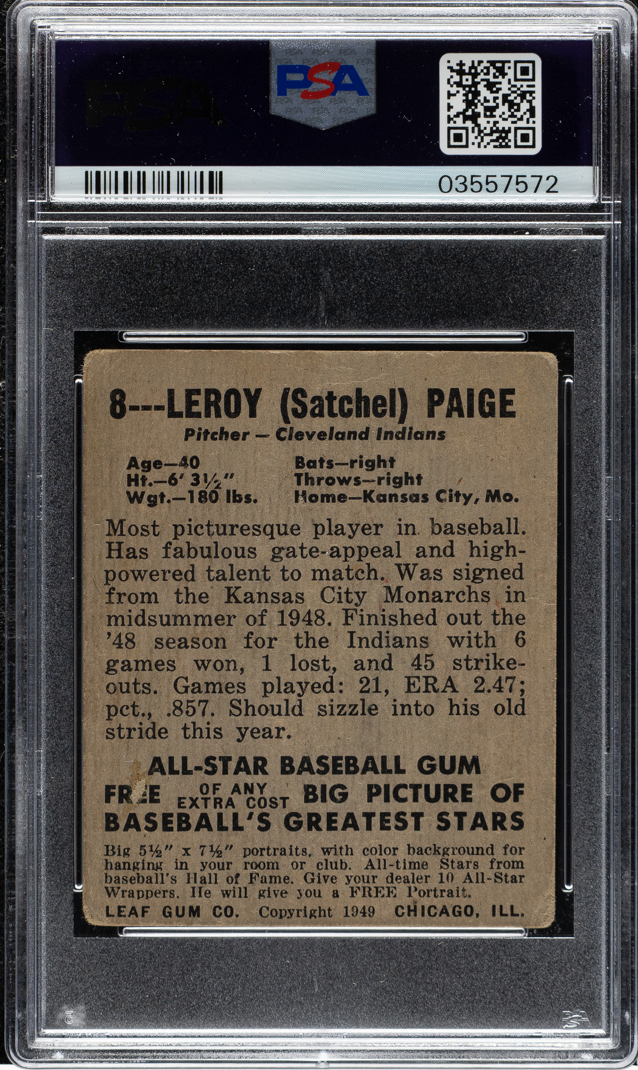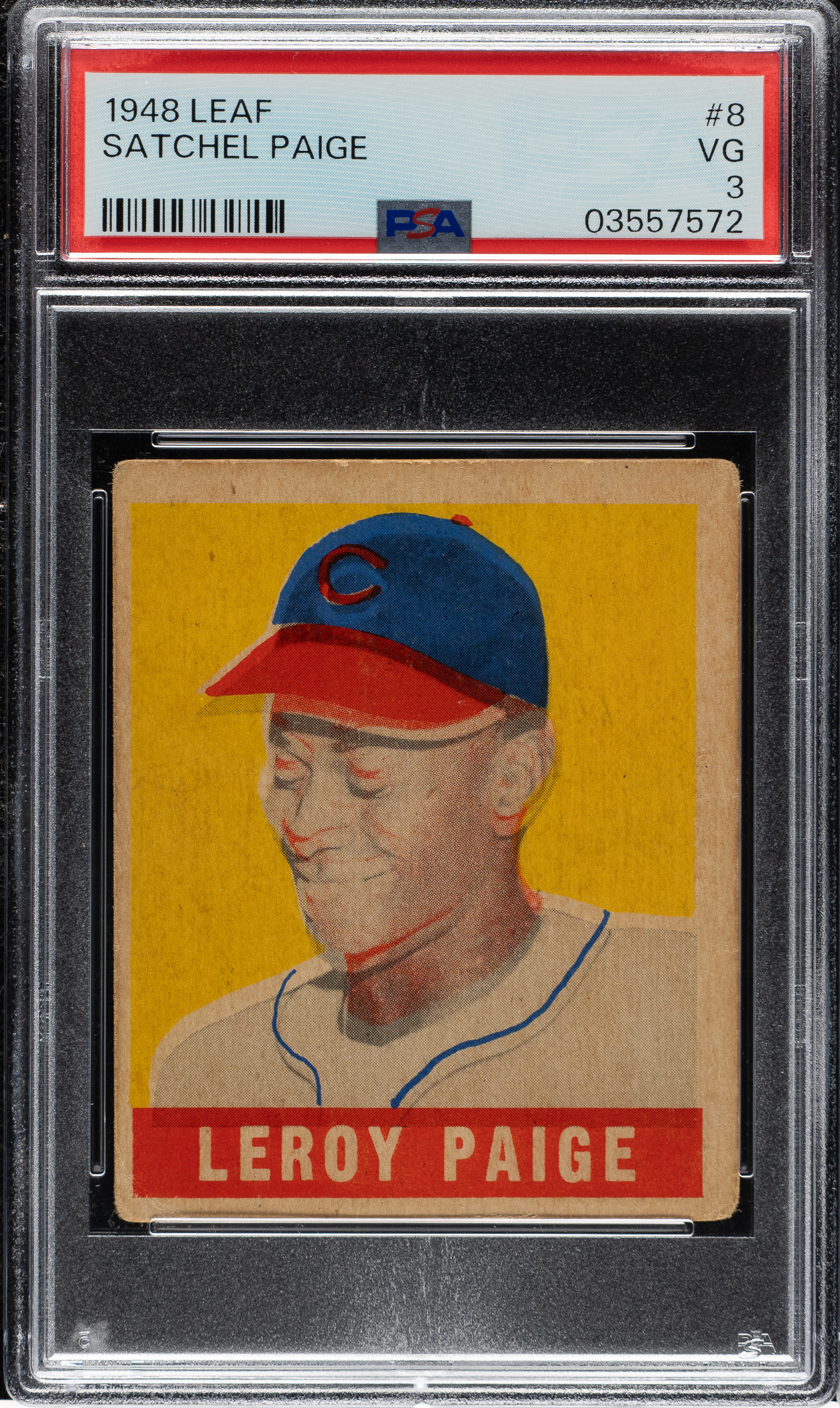 Graded VG 3 by PSA. Appealing example of 1948-1949 Leaf #8 Satchel Paige. This is one of card collecting's iconic classics. Paige’s Leaf rookie card is one of the rarest and most significant of all postwar baseball cards. Chicago's Leaf Gum Company produced the first multicolor baseball cards of the post-World War II era in 1948-1949. Forty-nine cards in the set are considered "standard," and the additional "short print" series of 49 cards in the set are so rare that "Rare Leafs" has long been a formal card-collecting hobby term. Leafs are without question one of the toughest postwar sets to complete because of all the rare cards. Paige is not only the key to this rare series, he is also the key to the 1948-1949 Leaf set. The Leaf card is also Paige’s most valuable. The card has bright colors, a slightly out-of-focus image, honest corner wear, and centering toward the bottom left. Boldly printed reverse has a touch of paper loss. This card presents a rare opportunity to acquire a modestly graded but visually pleasing example of one of the classic postwar baseball cards.