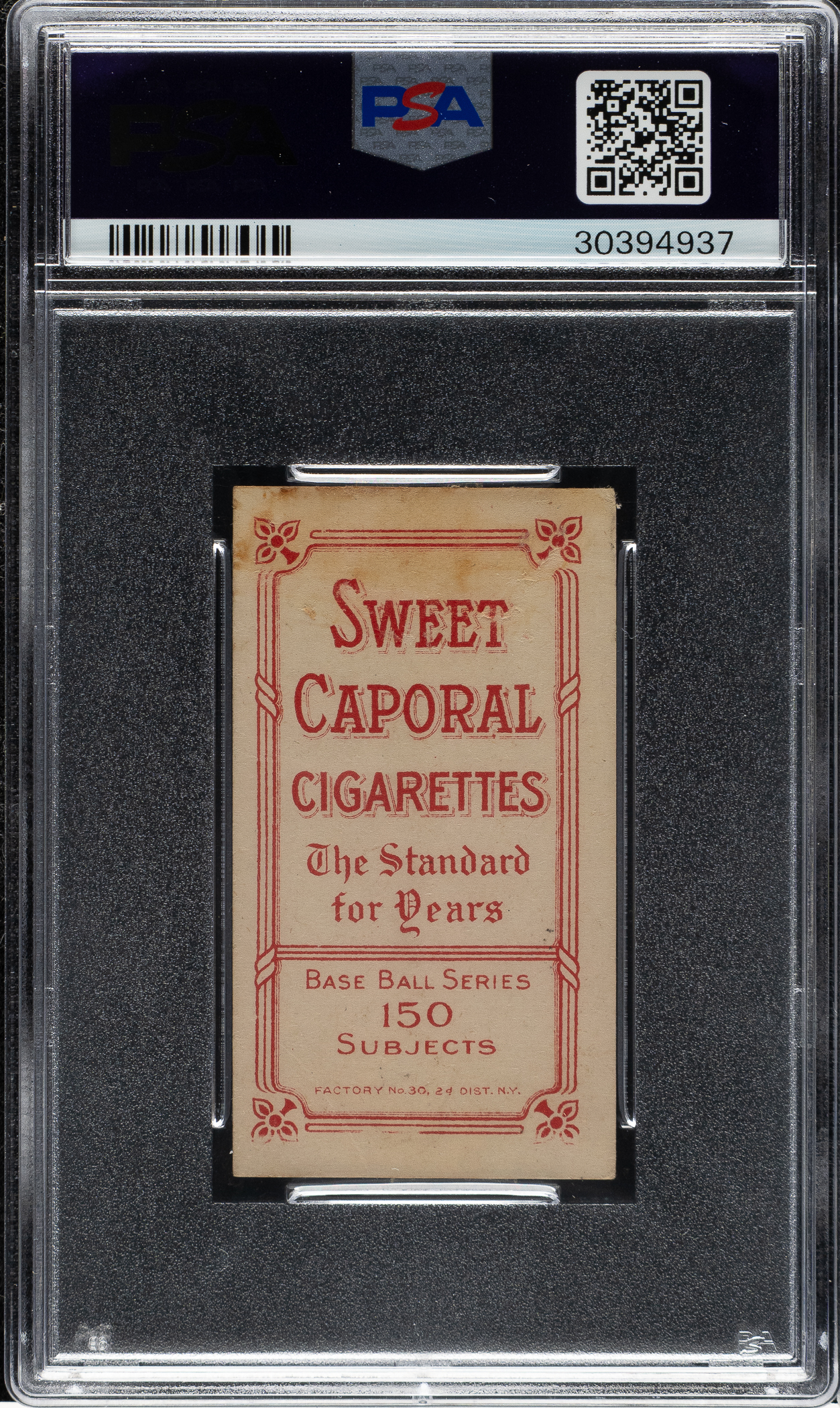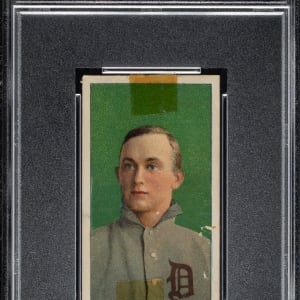 Modestly graded example of this classic tobacco card of Detroit Tigers Hall of Famer Ty Cobb. The green background portrait pose is the rarest of the four poses of Cobb in the T206 set. This well-centered example has a beautiful green background and a crisp image of Cobb. Graded POOR 1 by PSA, flaws include two pieces of clear tape affixed to the front and a few tiny spots of paper loss. Despite these condition issues, this remains a very presentable example of one of the key cards in the premier tobacco issue of the 1910 era.