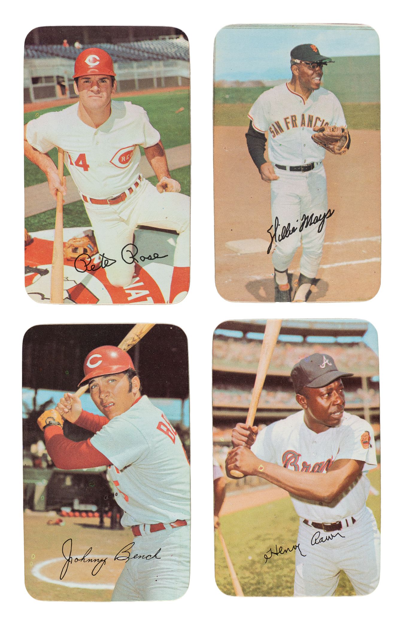 Presented is an extremely attractive high-grade partial set of 1971 Topps Super consisting of thirty-nine different cards (out of sixty-three in the set). This set is highlighted by many Hall of Famers and stars including Willie Mays, Hank Aaron, Pete Rose, and Reggie Jackson. Condition is 57% Nr/Mt-Mt (including some Mint), 30% Nr/Mt, and 13% slightly lesser. Keys: #20 Rose (Nr/Mt-Mt), 32 Bench (Ex-Mt), 38 Jackson (Nr/Mt), 44 Aaron (Ex), 48 Gibson (Ex-Mt), 49 Yastrzemski (Mint), 56 Mays (Ex-Mt due to centering), and 59 B. Robinson (Mint). Missing the following twenty-four cards for completion: #2, 3, 6, 9, 10, 11, 12, 14, 26, 30, 36, 37 Clemente, 39, 40, 43, 45, 47, 52, 53, 55, 57, 58, 62, and 63. Because of their high-quality production values and scarcity relative to other Topps sets of the era, it is a little surprising that this issue has not received more attention from collectors, but this is primarily because for many years grading companies did not have holders for this large-format issue. This is no longer the case, and collectors can now build sets of these cards in graded form just like they've done for many years with standard-sized cards. A very attractive high-grade collection with several notable highlights. Total: 39 cards.
