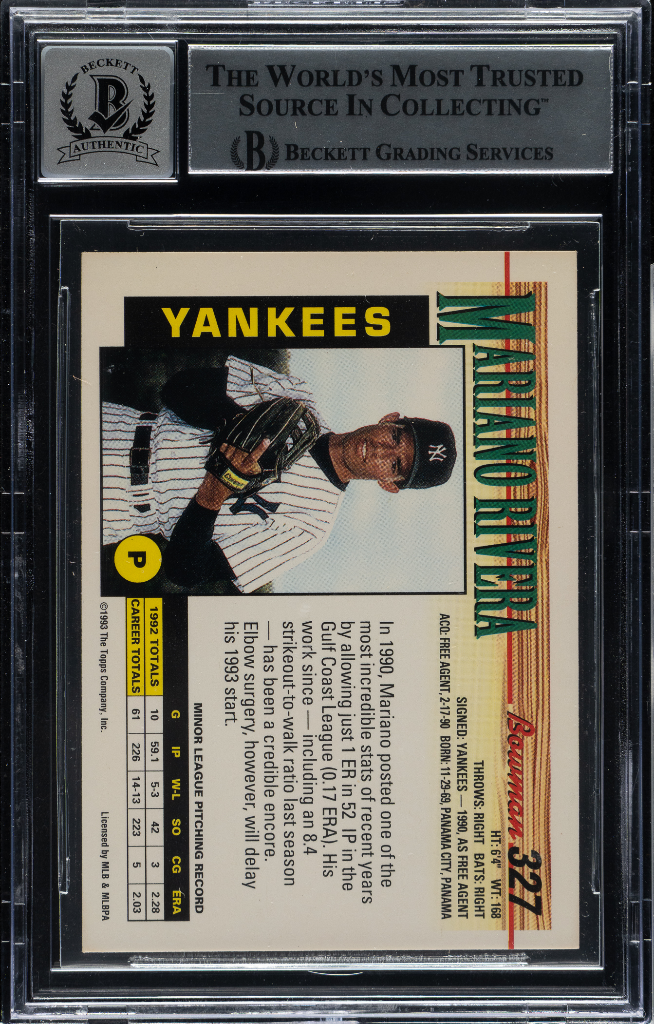 Beckett has encapsulated the card and graded the signature GEM MINT 10. New York Yankees Hall of Famer Mariano Rivera.