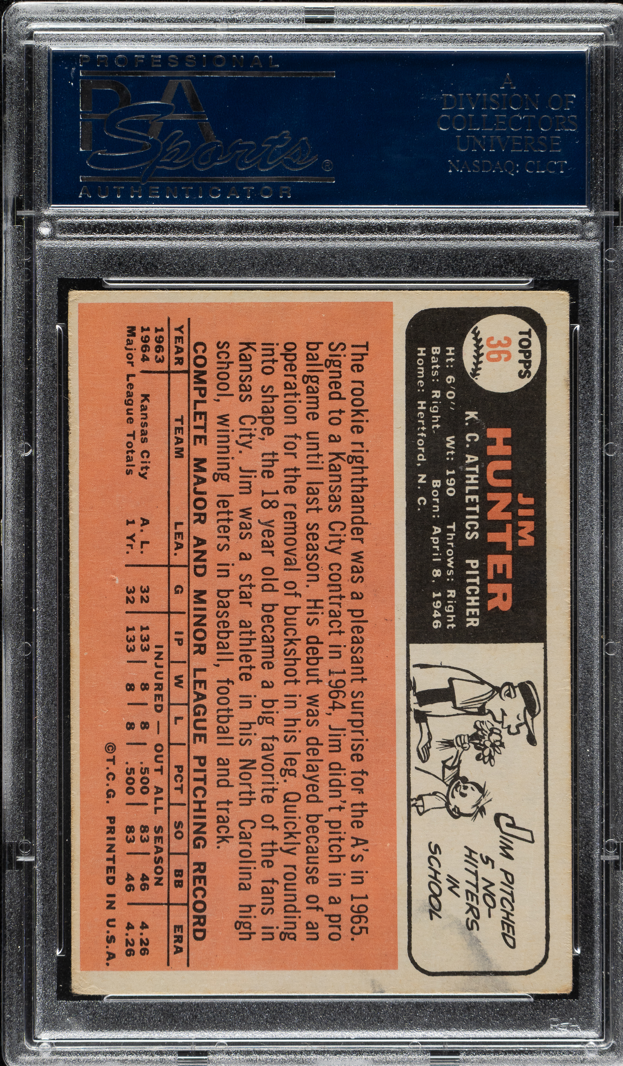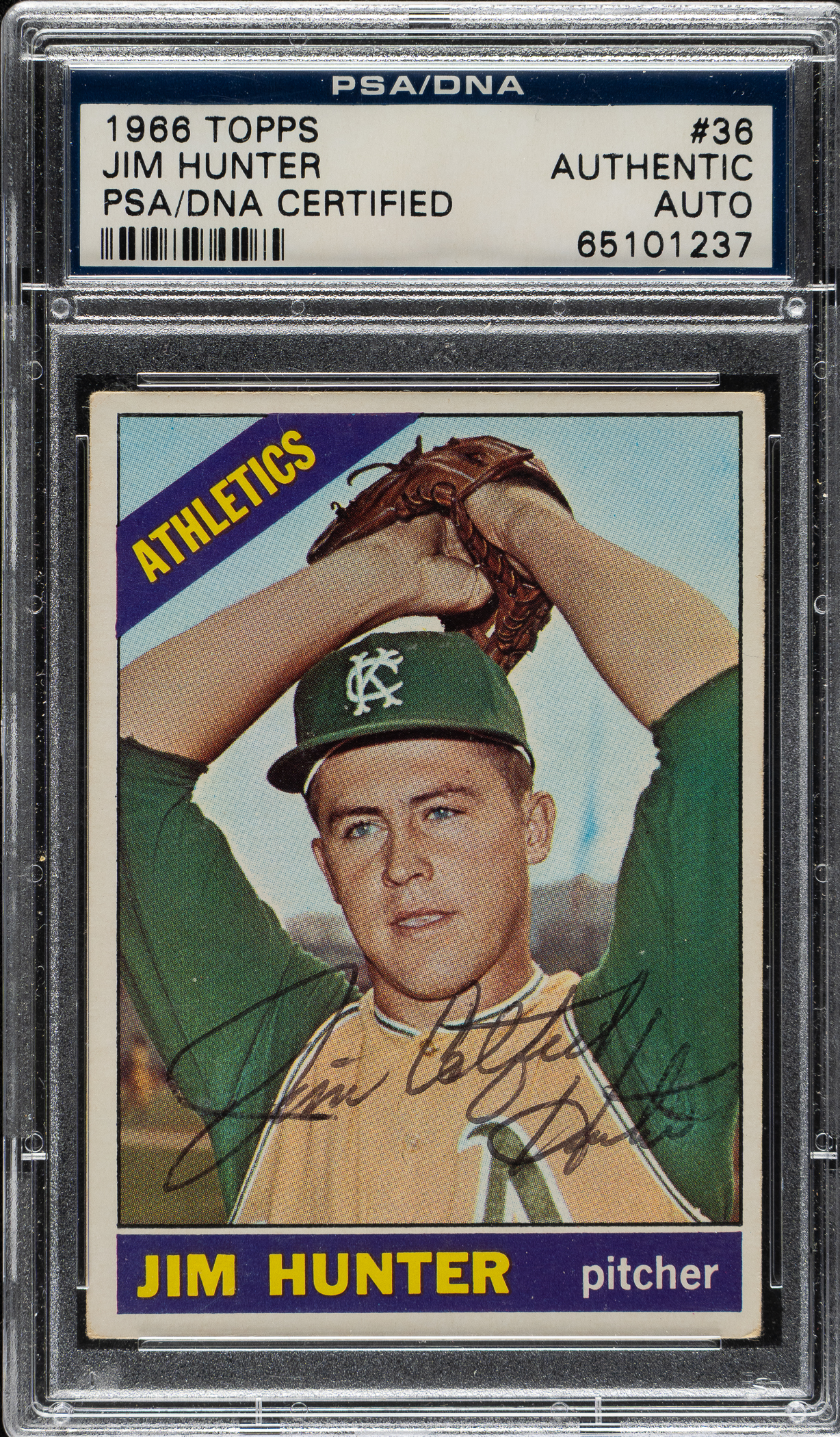 PSA/DNA has encapsulated the card, grading the signature Authentic. Kansas City Athletics Hall of Famer Jim Hunter.