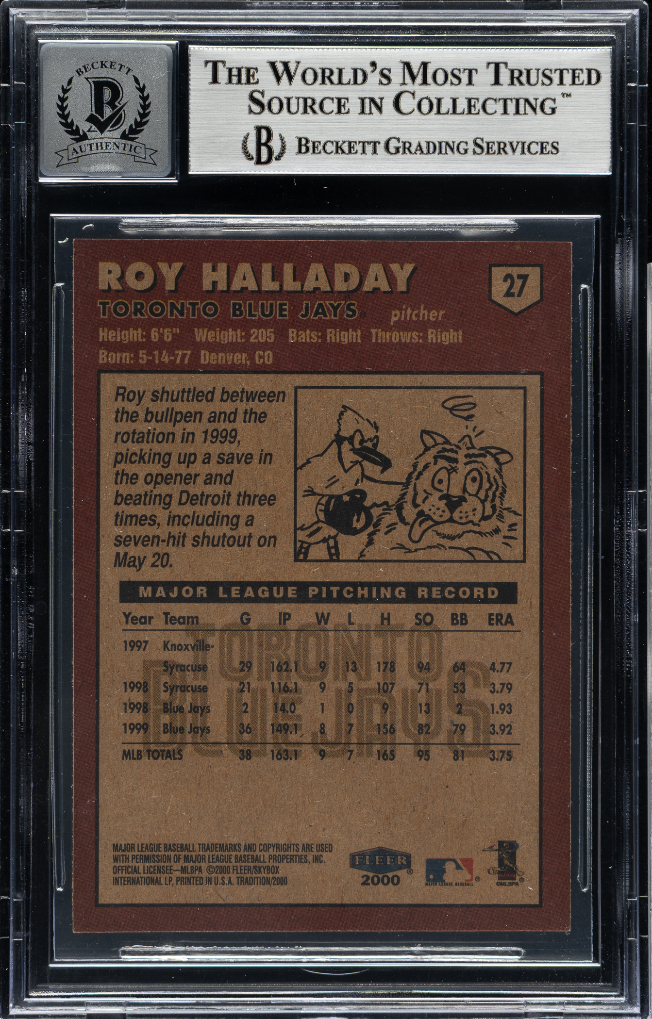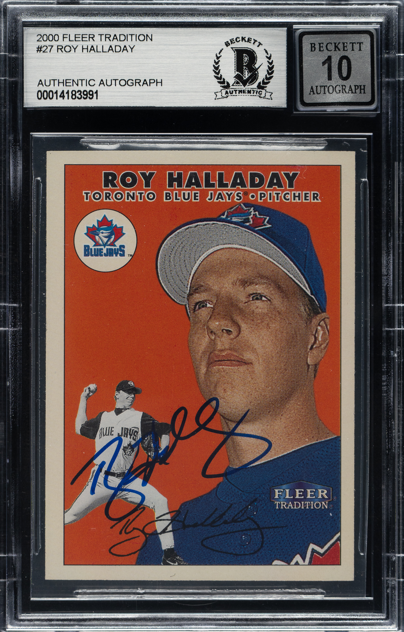Beckett has encapsulated the card and graded the signature GEM MINT 10. Toronto Blue Jays Hall of Famer Roy Halladay.