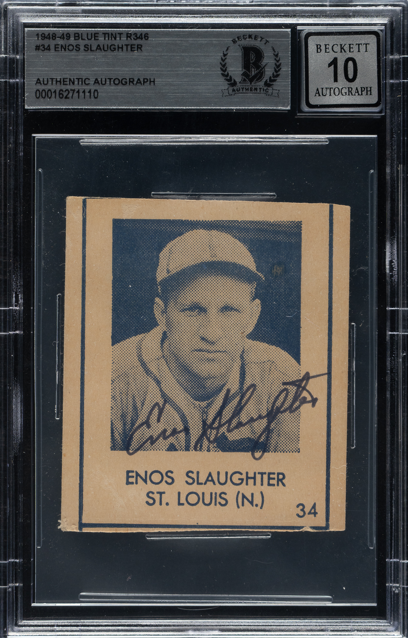 Beckett has encapsulated the card and graded the signature GEM MINT 10. St. Louis Cardinals Hall of Famer Enos Slaughter.
