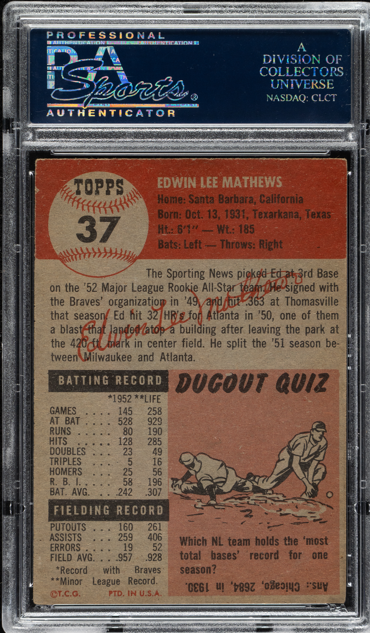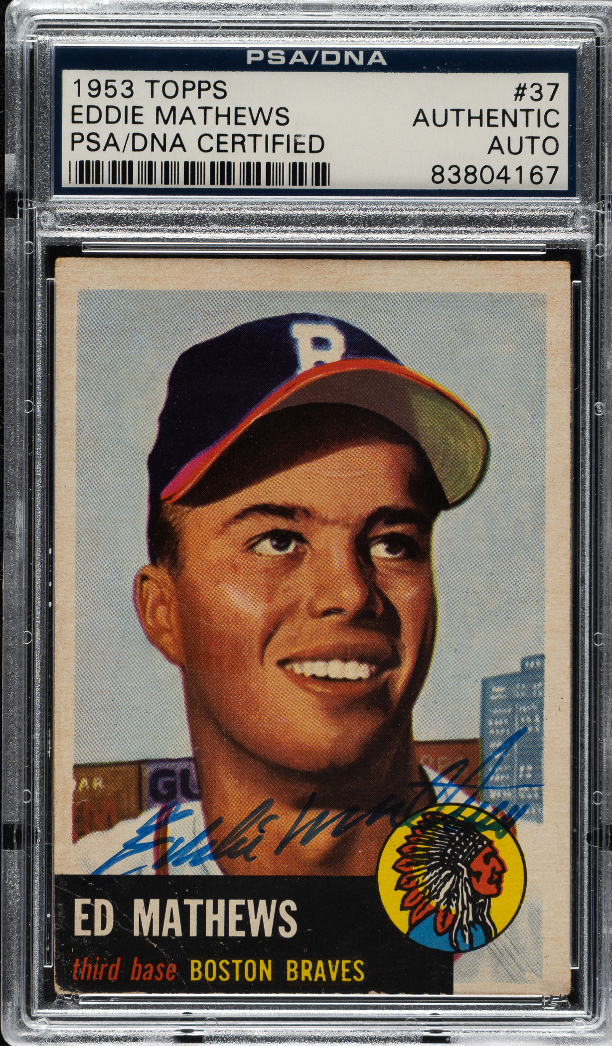 PSA/DNA has encapsulated the card, grading the signature Authentic. Milwaukee Braves Hall of Famer Ed Mathews.