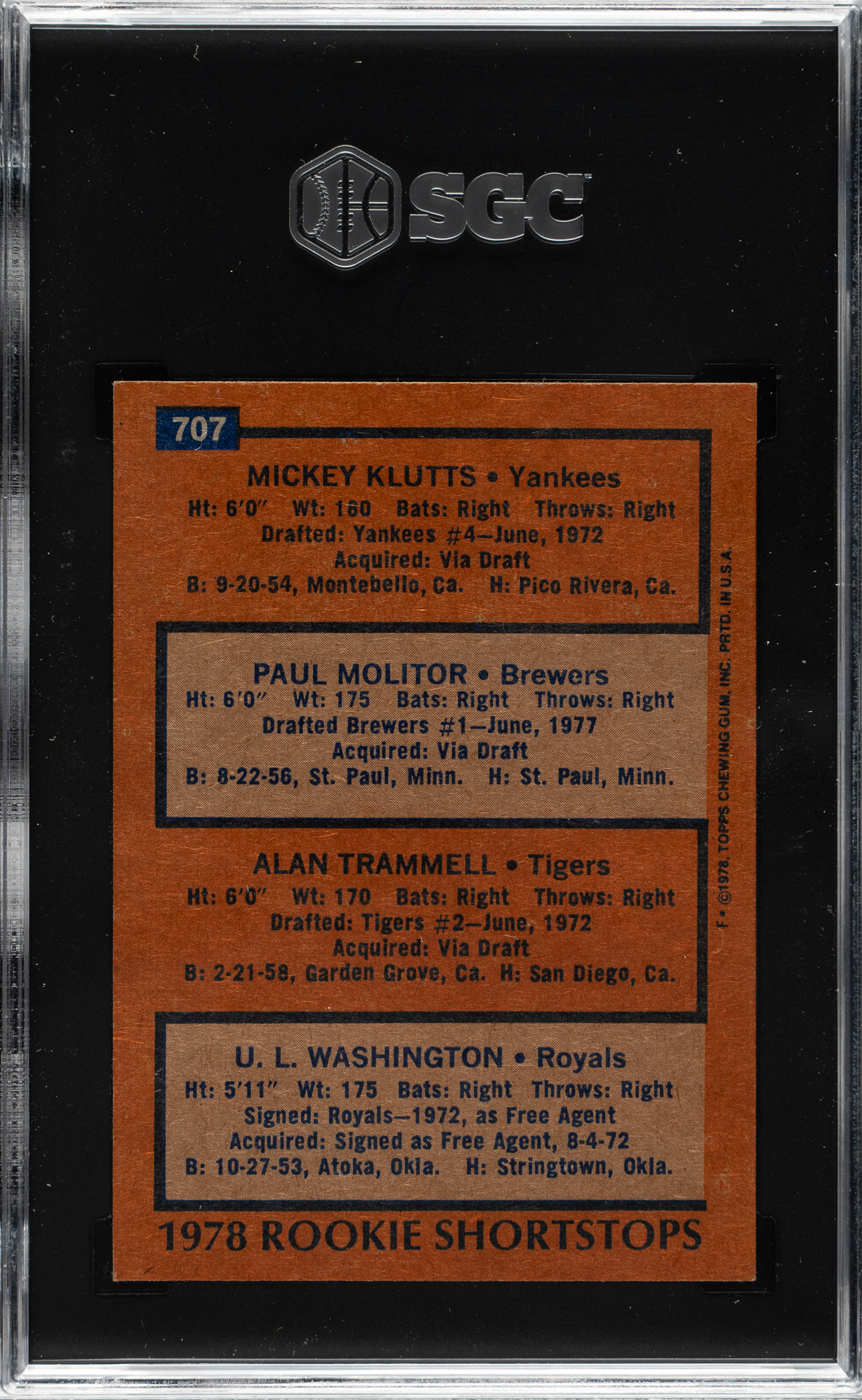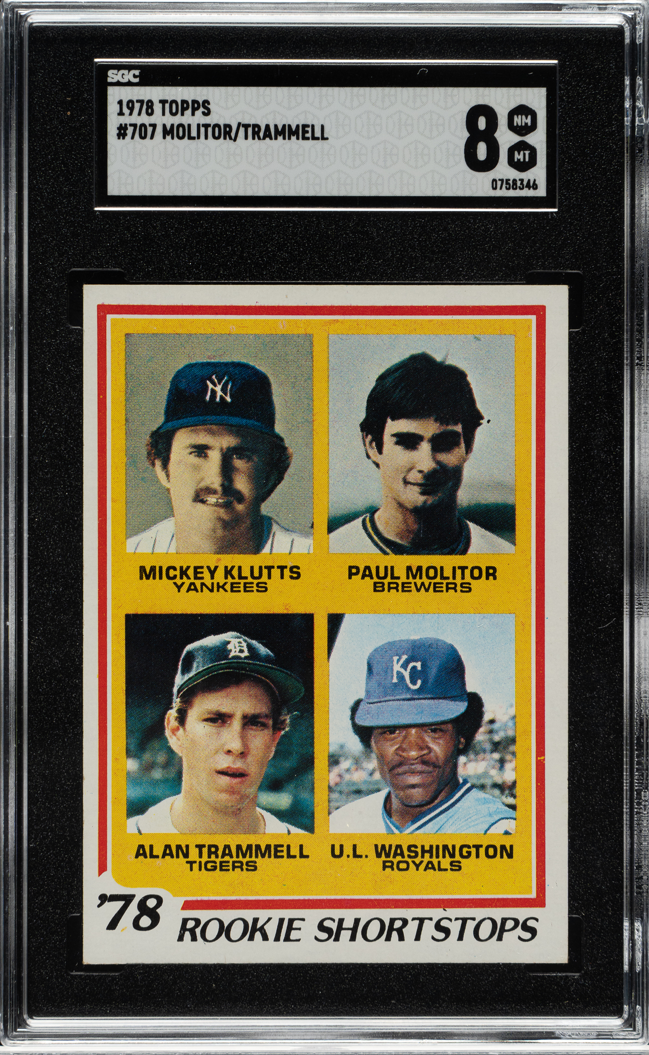 Graded NM/MT 8 by SGC. Milwaukee Brewers Hall of Famer Paul Molitor and Detroit Tigers Hall of Famer Alan Trammell.