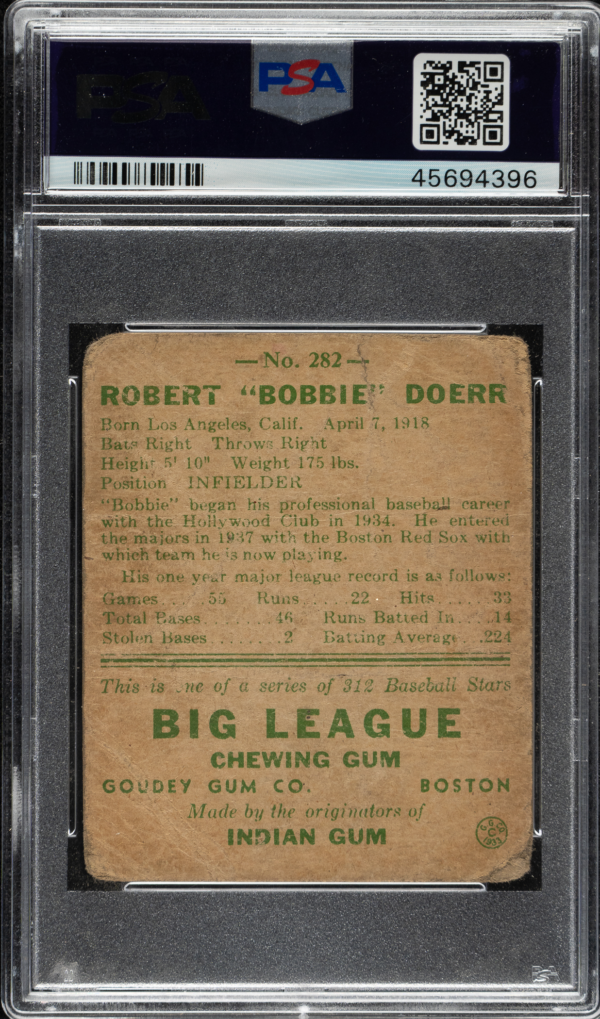 Graded POOR 1 by PSA. Boston Red Sox Hall of Famer Bobby Doerr.