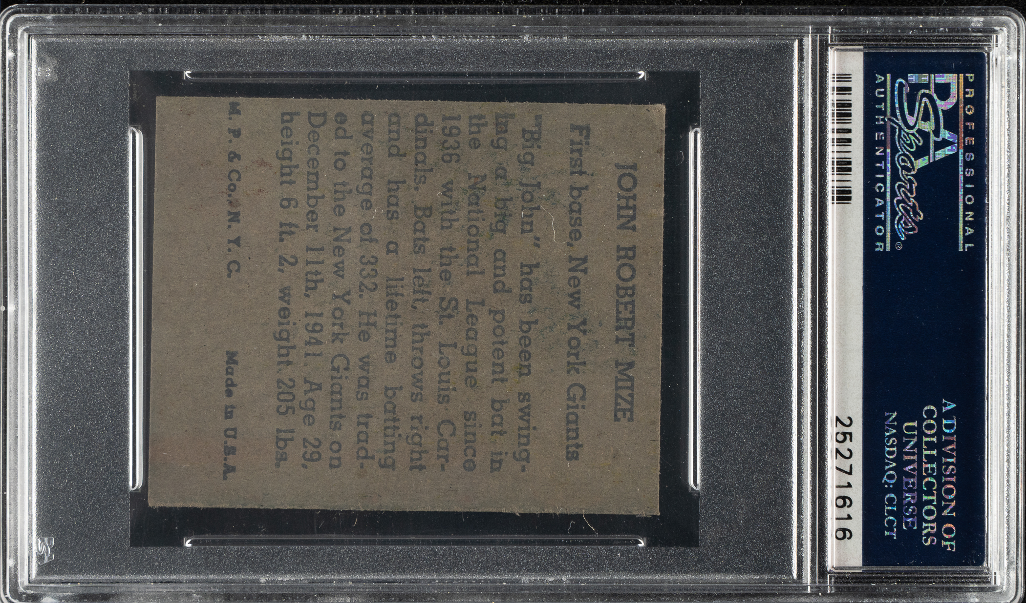 Graded NM 7 by PSA. New York Giants Hall of Famer Johnny Mize.