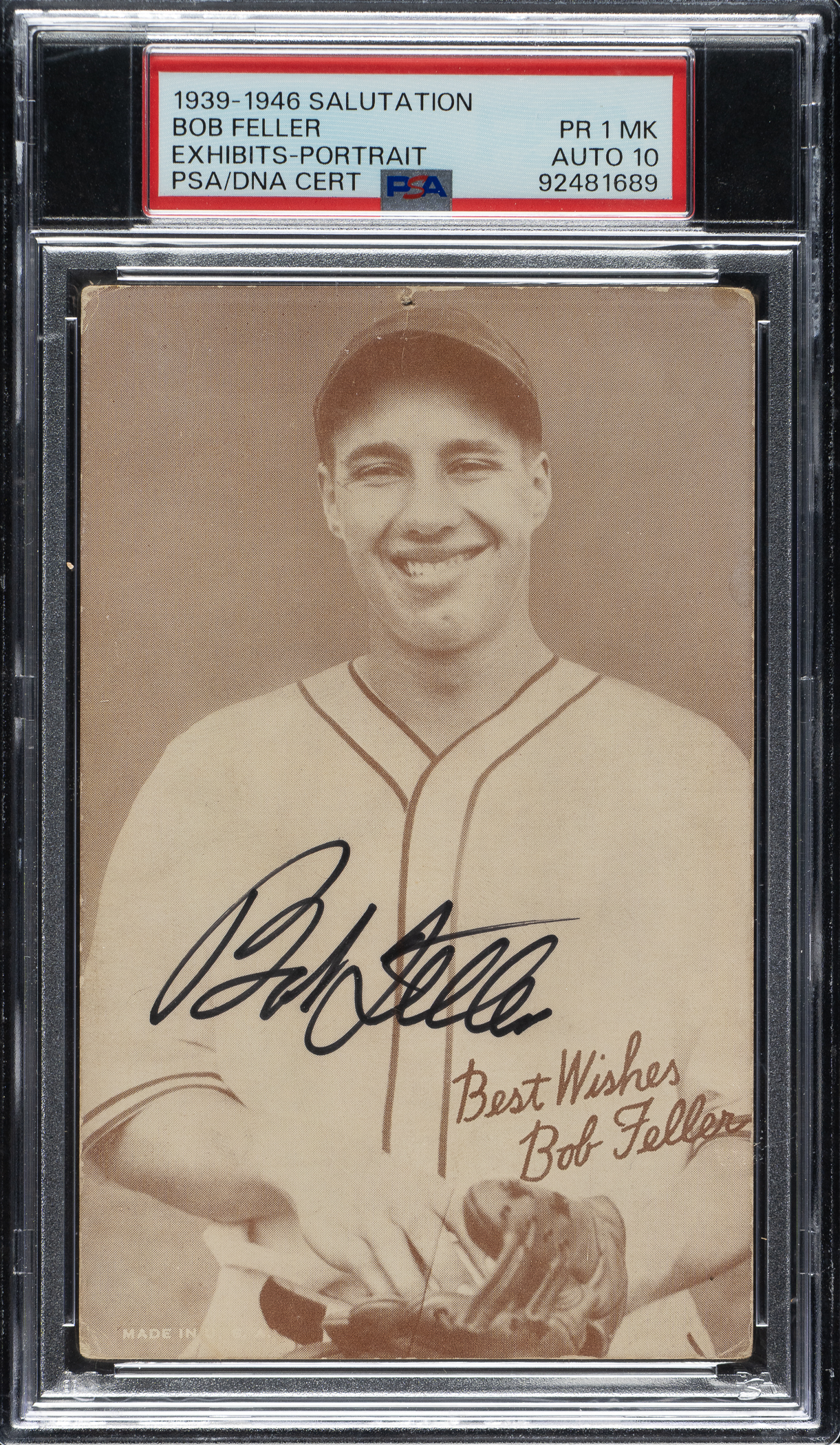PSA/DNA has encapsulated the card, grading the signature GEM MINT 10 and the card POOR 1 (MK). Cleveland Indians Hall of Famer Bob Feller.