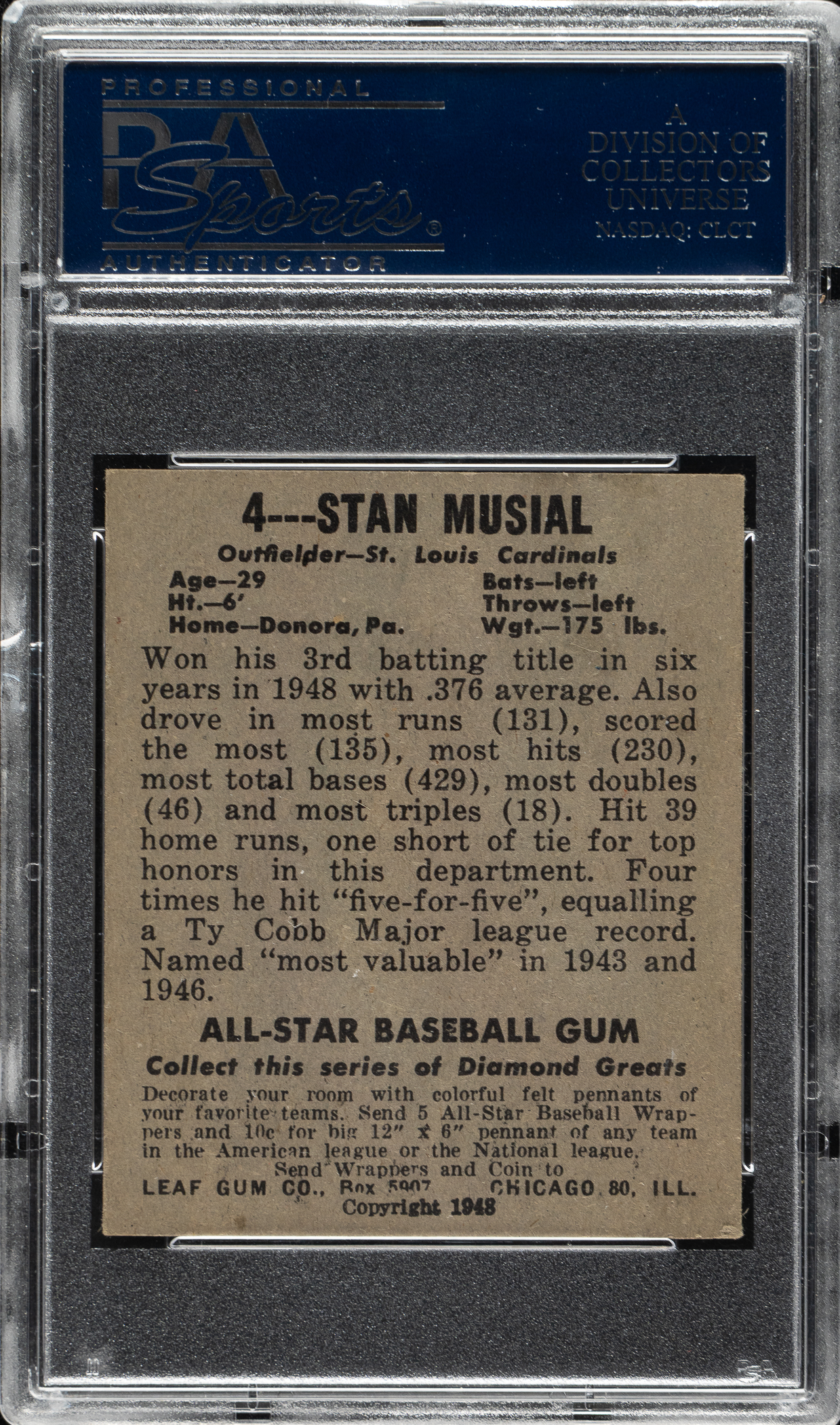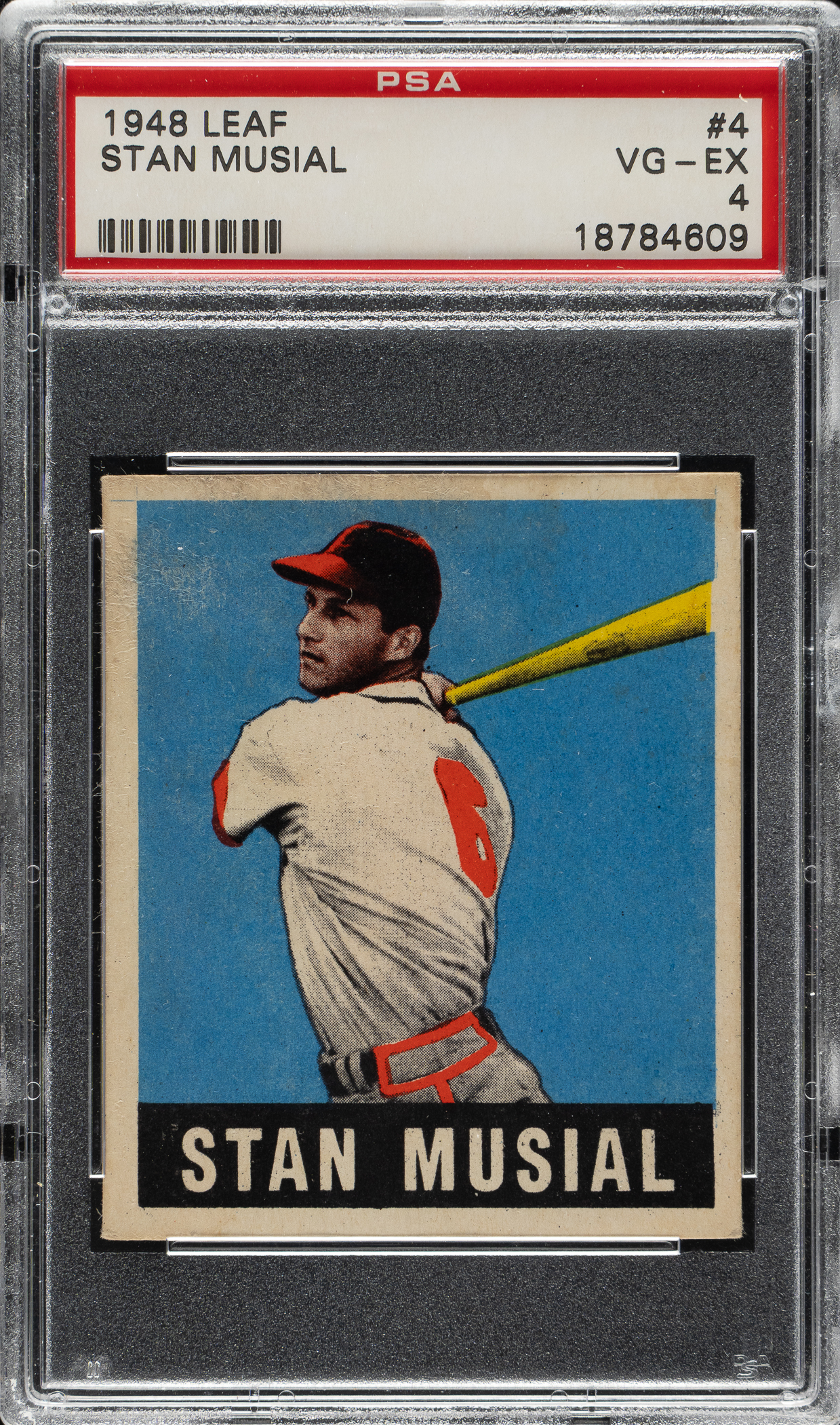 Graded VG-EX 4 by PSA. Mid-grade example of this classic rookie card of St. Louis Cardinals Hall of Famer Stan Musial. The 1948-1949 Leaf Bubble Gum card of Musial is one of the most popular and striking of all his cards. The cards manufactured by Leaf Gum Co. in 1948 and 1949 are often encountered with many problems (excessive toning, general wear from fragile paper stock, soft corners, centering issues, and print lines), and collectors also must deal with the wildly varying degrees of print quality that characterize the set. It is easy to see why 1948-1949 Leafs are some of the most difficult of all cards to collect in high grade. The offered example displays vibrant colors, outstanding registration, and light corner wear. The reverse has bold black text. Downgraded slightly due to paper residue on the upper left quadrant. This is a strong mid-grade example of one of the icons of postwar Hall of Fame card collecting.