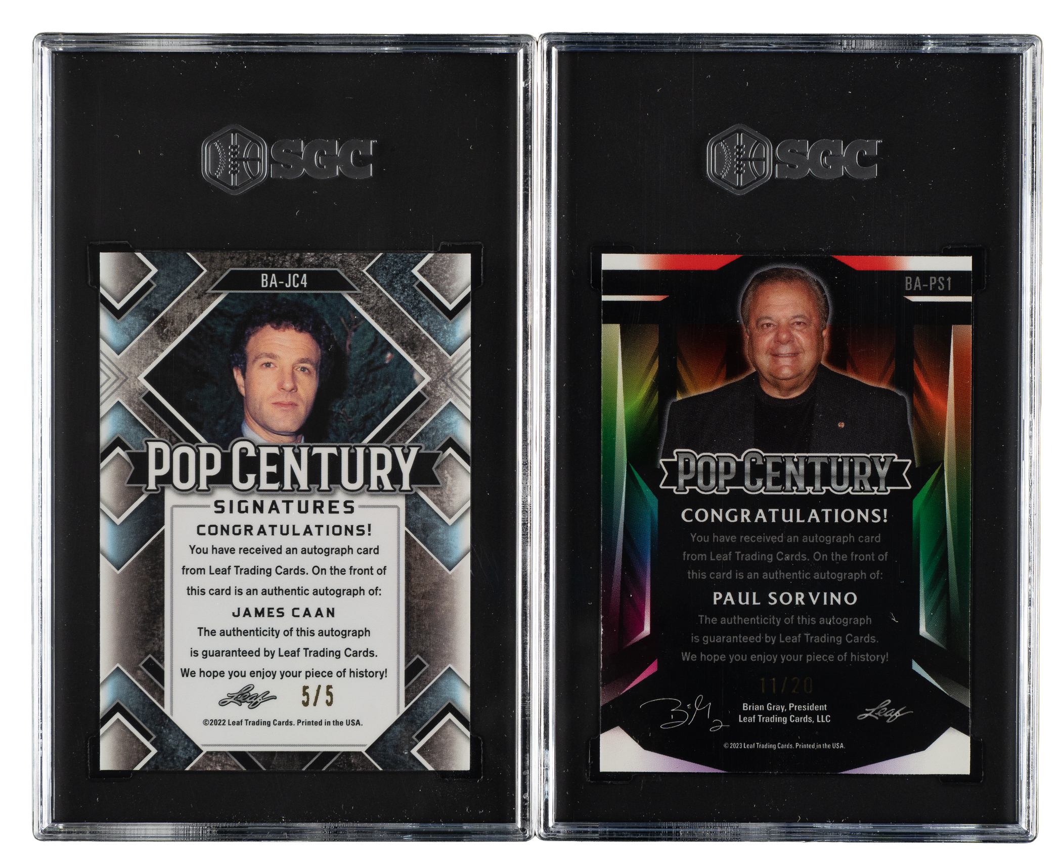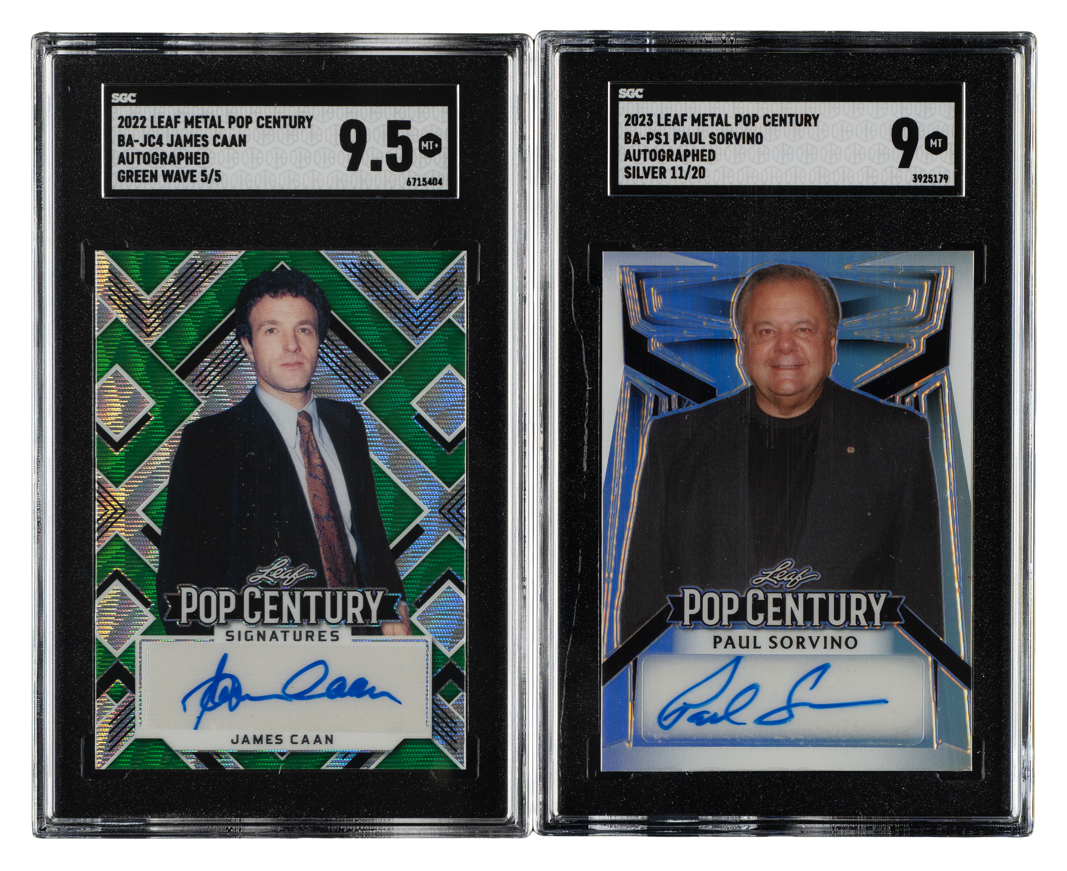 Pair of 2022 and 2023 Leaf Metal Pop Century Autographs cards, both graded and encapsulated by SGC. This pair consists of the following: 1) 2022 Leaf Metal Pop Century Autographs #BA-JC4 James Caan Green Wave #5/5 (MINT+ 9.5). 2) 2023 Leaf Metal Pop Century Autographs #BA-PS1 Paul Sorvino Silver #11/20 (MINT 9). Total: 2 cards.