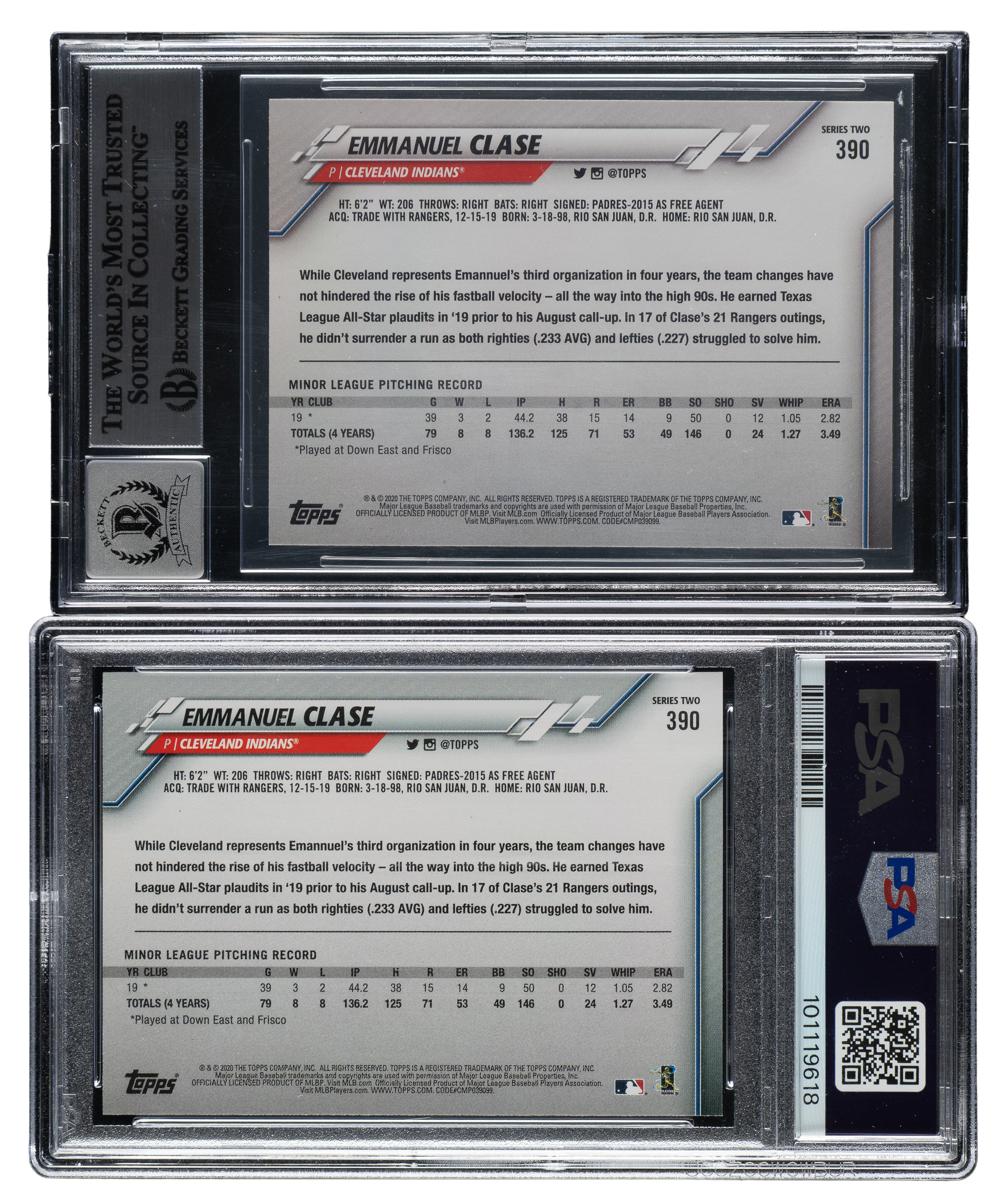 Pair of 2020 Topps cards, both graded and encapsulated by PSA or Beckett. This pair consists of the following: 1) 2020 Topps #390 Emmanuel Clase (PSA GEM MINT 10). 2) Signed 2020 Topps #390 Emmanuel Clase (Beckett GEM MINT 10 Signature). Total: 2 cards.
