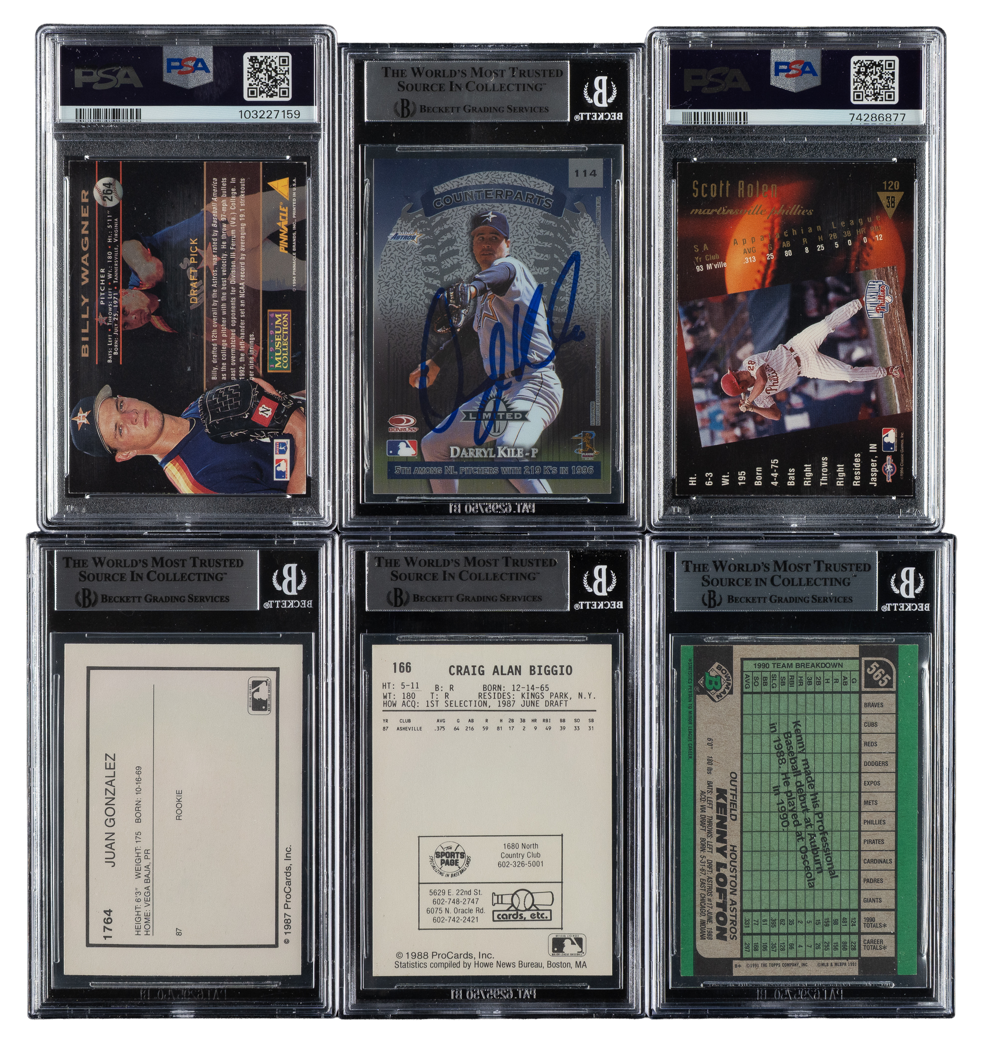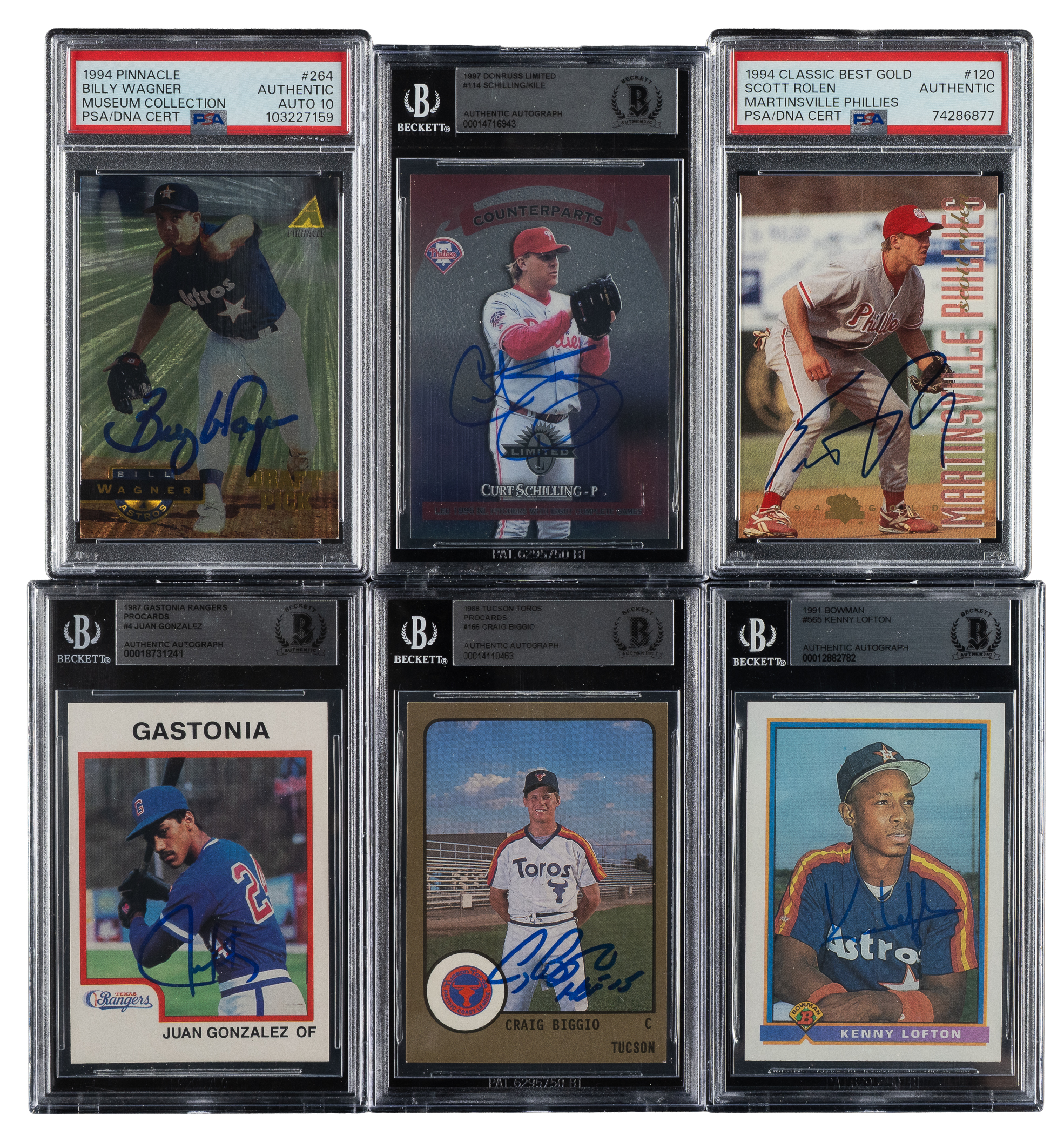 Collection of six 1987 to 1997 Bowman, Procards, and Donruss cards, each graded and encapsulated by PSA/DNA and Beckett. This collection consists of the following: 1) Signed 1987 Procards Castonia Rangers Juan Gonzalez (Beckett Authentic). 2) Signed 1988 Procards Tuscon Toros Craig Biggio (Beckett Authentic). 3) Signed 1991 Bowman #565 Kenny Lofton (Beckett Authentic). 4) Signed 1994 Pinnacle Museum Collection #264 Billy Wagner (PSA/DNA GEM MINT 10). 5) Signed 1994 Classic Best Gold #120 Scott Rolen (PSA/DNA Authentic). 6) Signed 1997 Donruss Limited #114 CUrt Schilling/Darryl Kile (Beckett Authentic). Total: 6 cards.