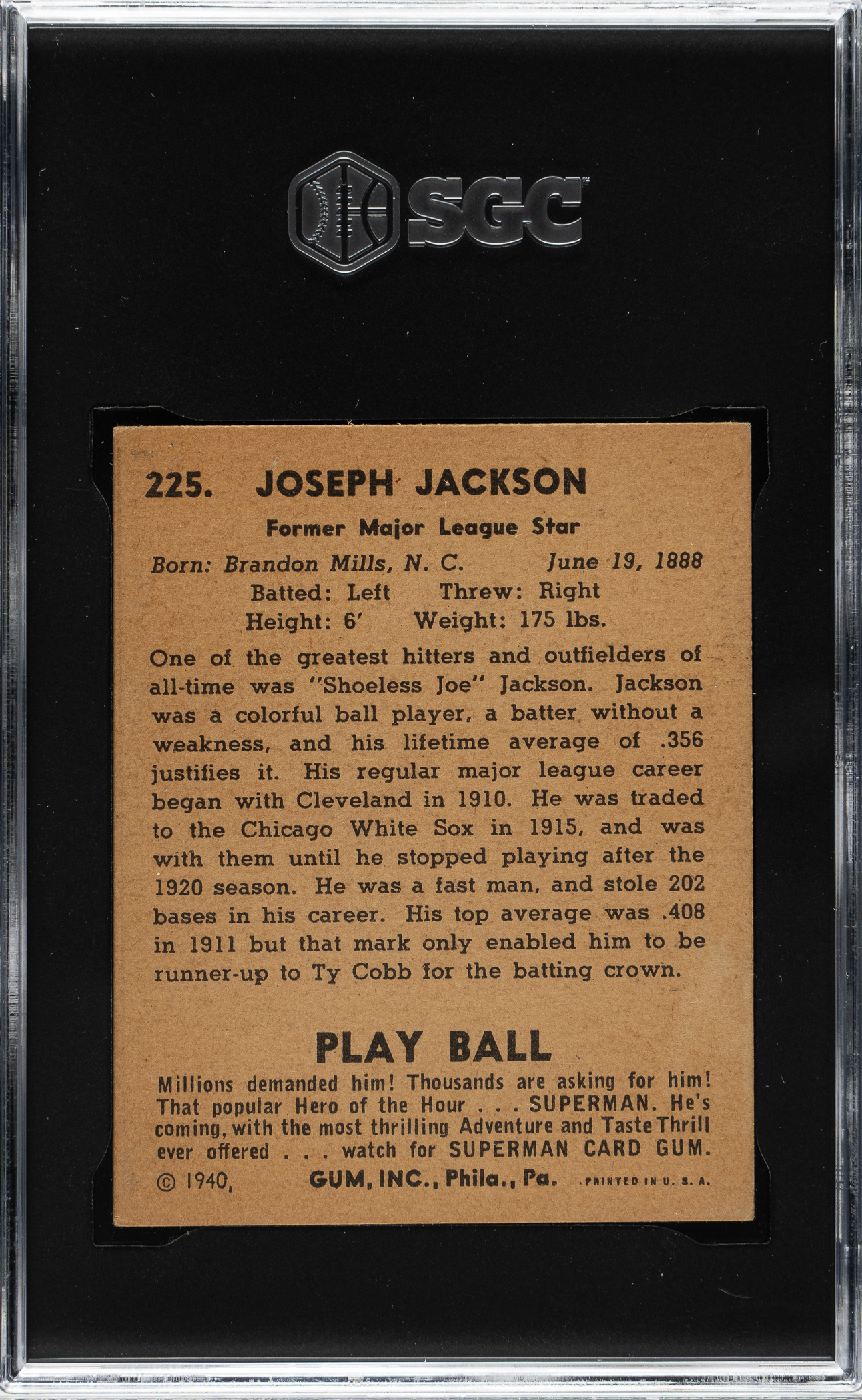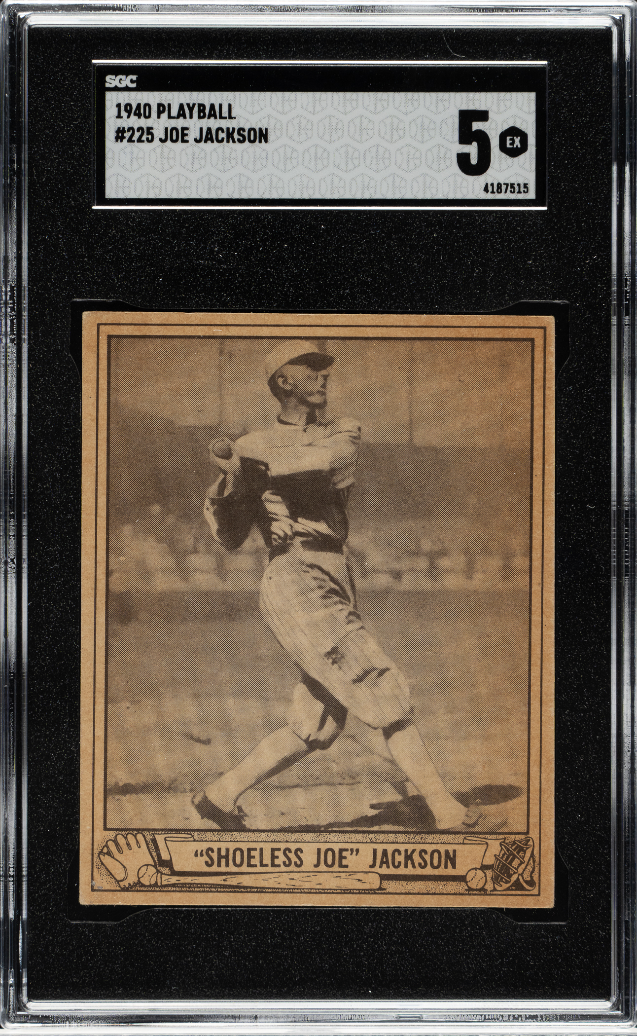 Graded EX 5 by SGC. The legend of Joe Jackson is monumental in our hobby. Though he was one of the greatest players to ever take the field, his banishment from the game has made him larger than life. The offered card was produced 20 years after Jackson and seven other "Black Sox" were banned from the game by Judge Landis for throwing the 1919 World Series. Interestingly, the back of this card makes no mention of this. It states that "he was traded to the White Sox in 1915 and was with them until he stopped playing after the 1920 season." Unfortunately for collectors, there are few vintage cards of Joe Jackson. This 1940 Play Ball card is one of the few and is particularly fascinating as it was issued when the memory of the scandal was still fresh in the minds of baseball fans. The card has outstanding image clarity and light corner wear. The reverse displays bold text. This is a strong mid-grade example of this classic Jackson card.