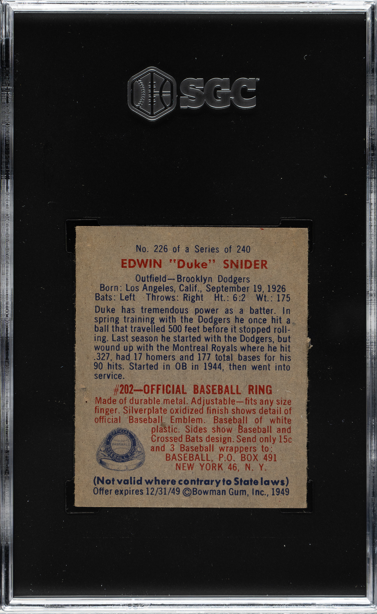 Graded NM 7 by SGC. Brooklyn Dodgers Hall of Famer Duke Snider.