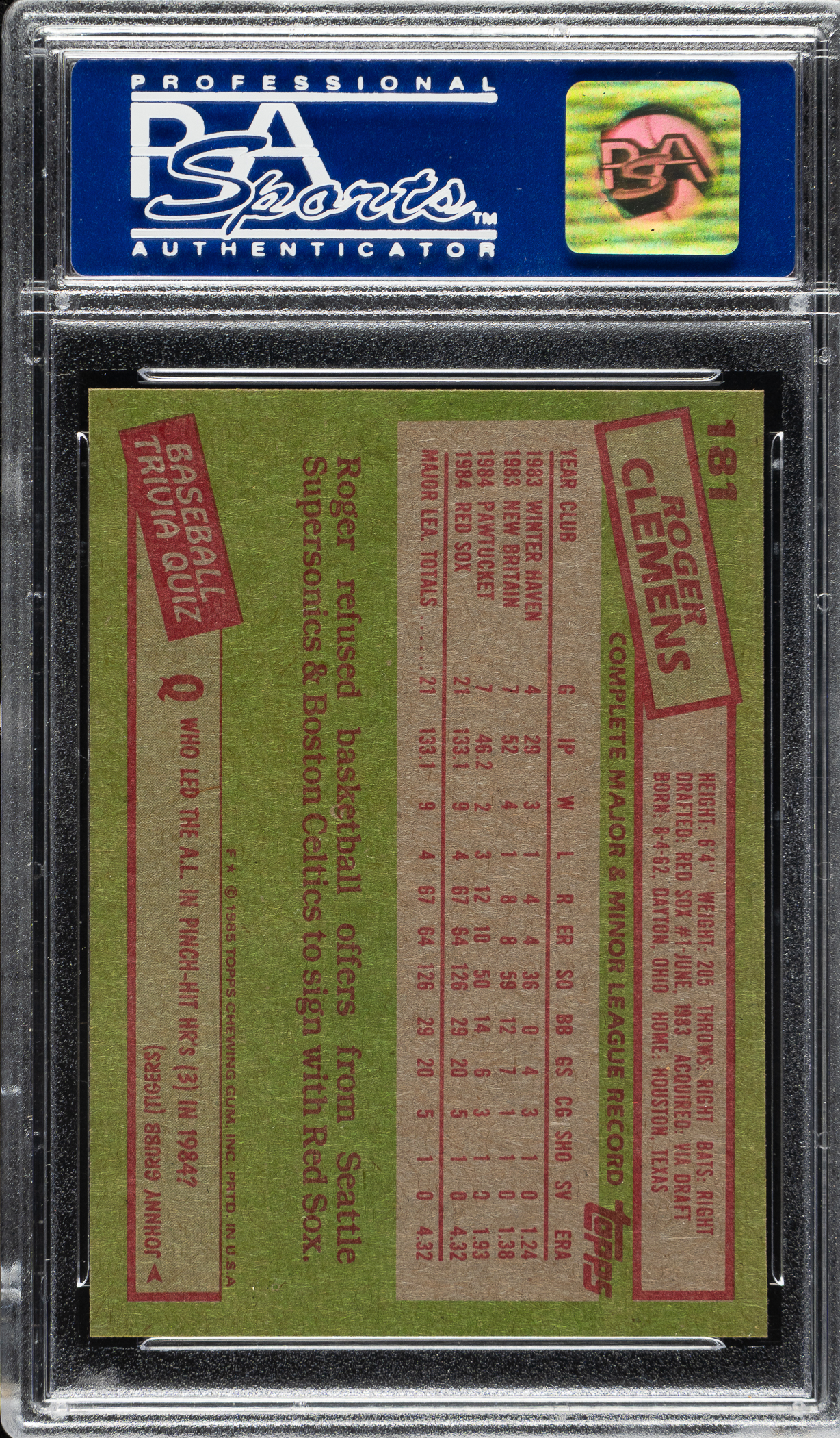 Lot # 2225: 1985 Topps #181 Roger Clemens Rookie PSA MINT 9
