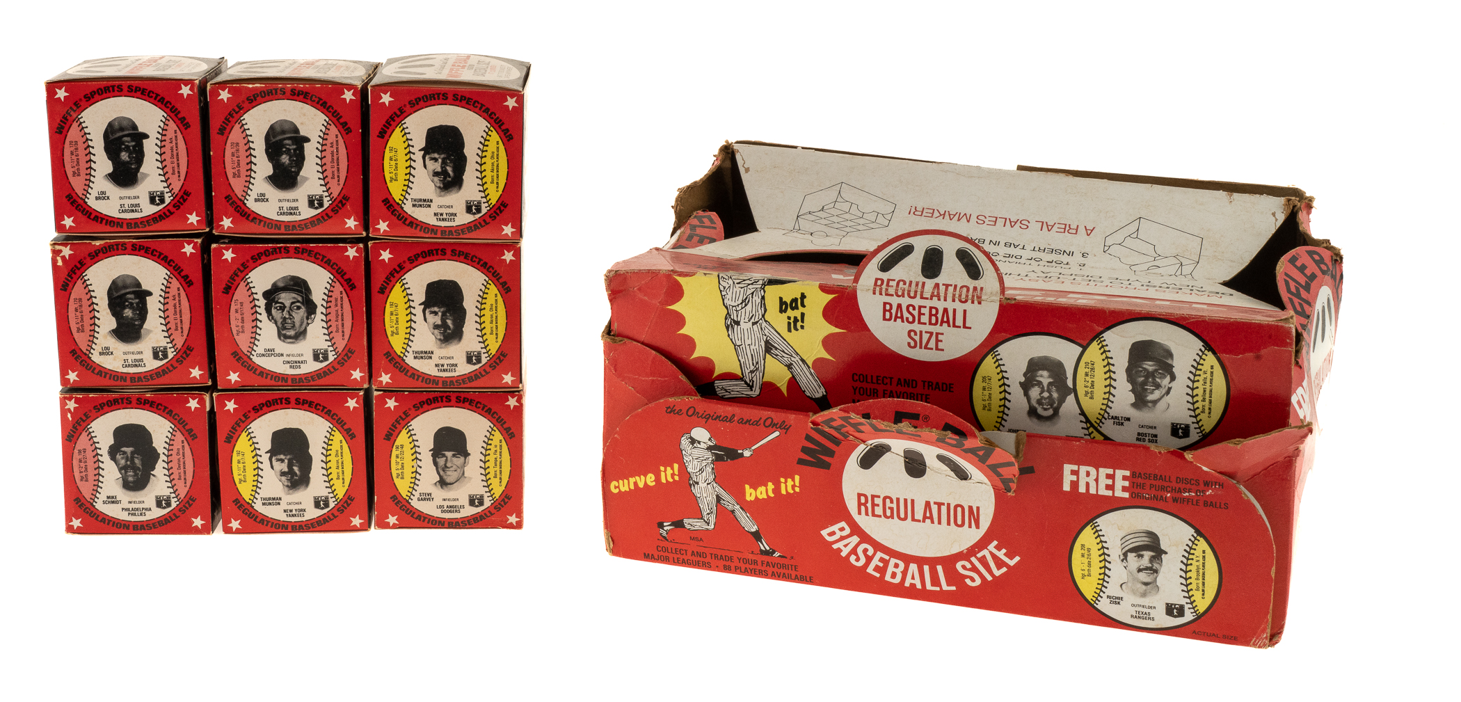 Since the 1880s, baseball players have lent their images and endorsements to a wide variety of products. Offered is a collection of nine (two different) player-endorsed Wiffle Ball boxes, dating from 1979, featuring Hall of Famers and stars Lou Brock, Mike Schmidt, Dave Conception, Thurman Munson, and Steve Garvey. This group includes all regulation size Wiffle balls still in the box. In addition, the nine Wiffle Ball boxes are presented here in their original store-display box, which has images of Johnny Bench, Carlton Fisk, Reggie Jackson, and Pete Rose pictured on the side panels. The display box (12 x 9 x 6 inches) remains in modest condition with a number of creases and tears visible throughout. The interior balls and boxes are in Excellent condition overall. Total: 10 items. The size/weight of this item requires that there will be an additional shipping charge for this lot.