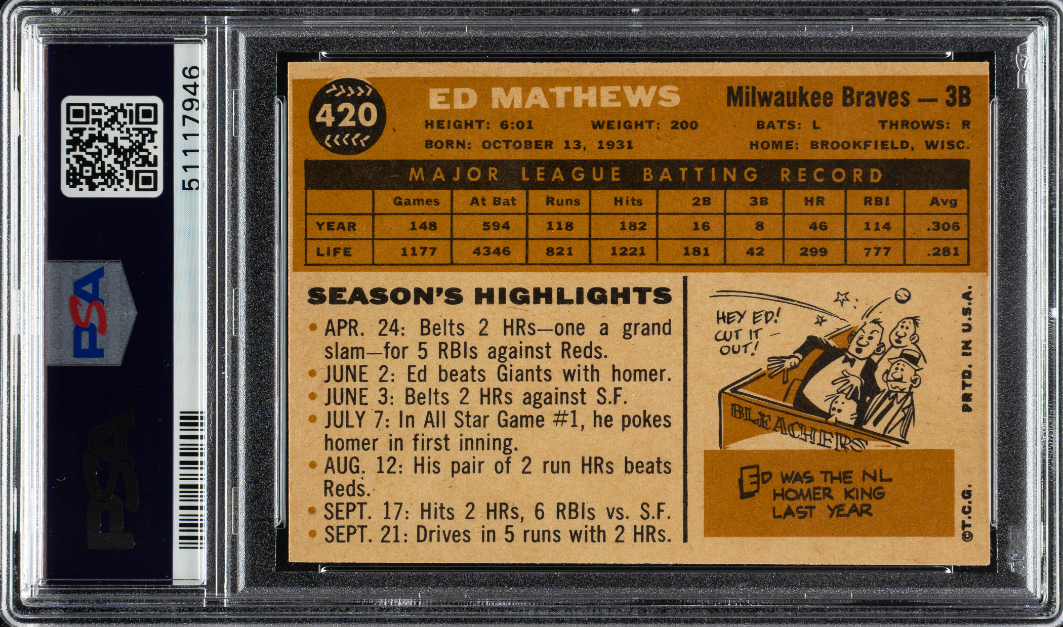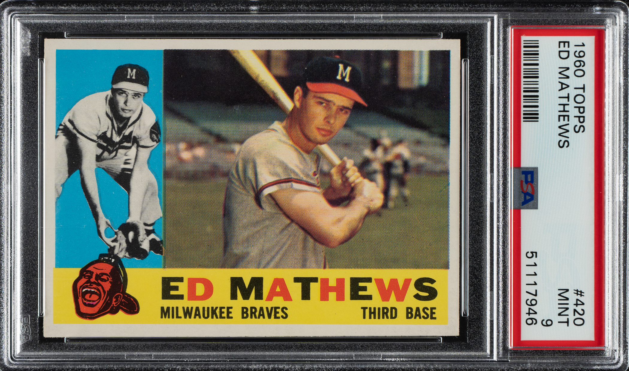 Graded MINT 9 by PSA. Milwaukee Braves Hall of Famer Ed Mathews. To date, not a single example has been graded higher out of 2,771 evaluated by PSA!