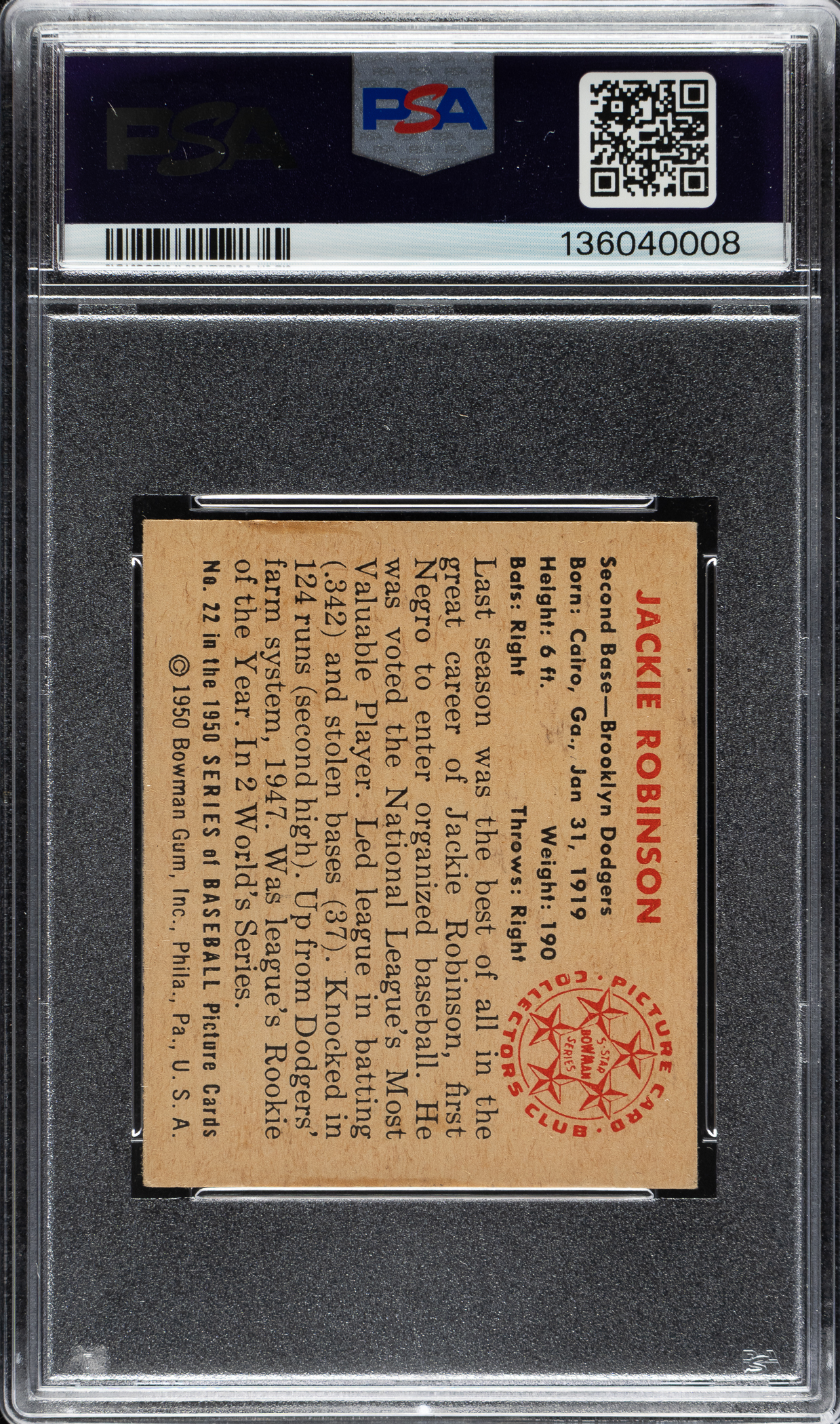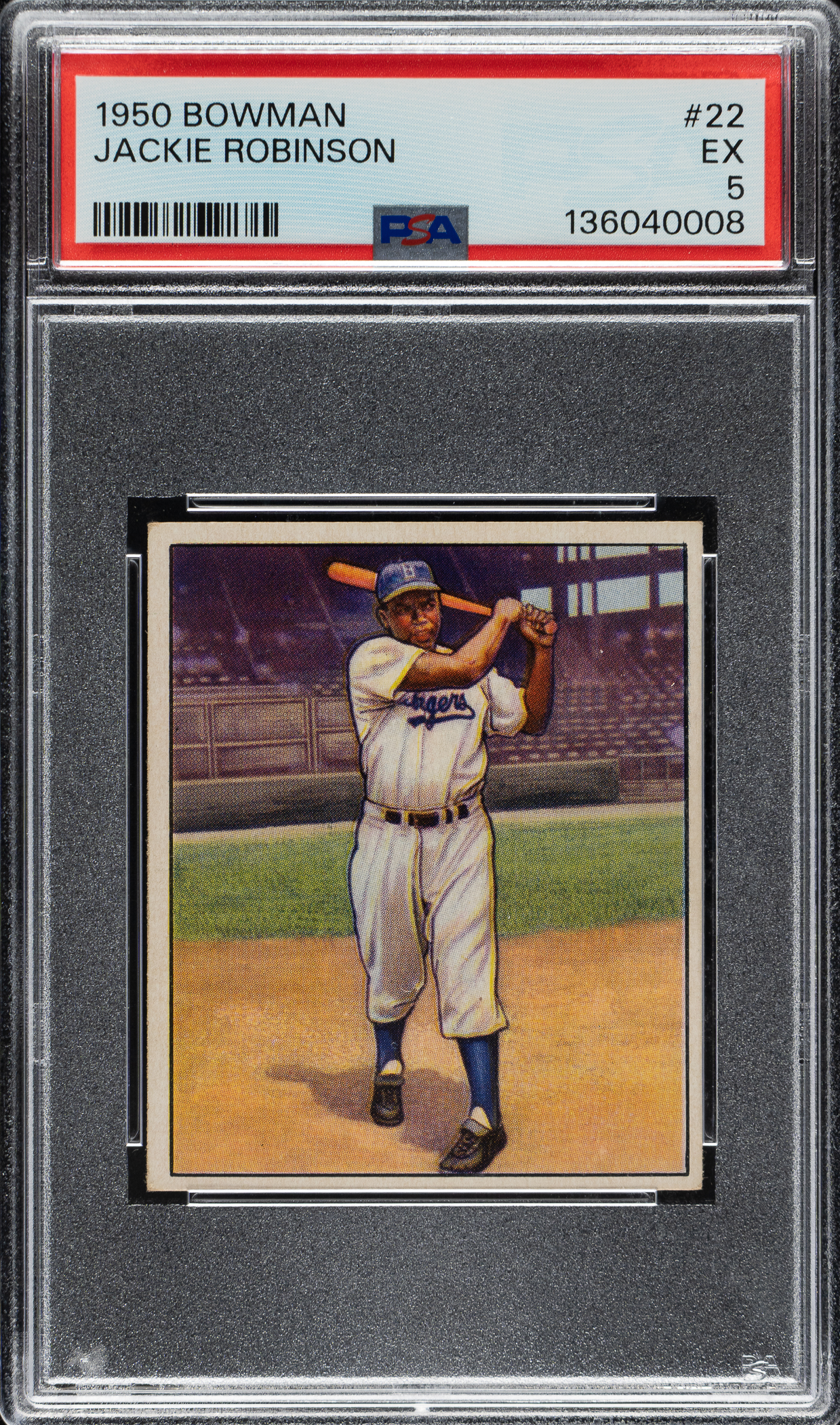 Graded EX 5 by PSA. Attractive mid-grade example of Brooklyn Dodgers Hall of Famer Jackie Robinson from the 1950 Bowman set. One of the key cards to this early Bowman issue, Robinson is pictured in a full-color batting pose. The offered card displays bright colors, outstanding registration, and light corner wear. Clean reverse with bold black text.