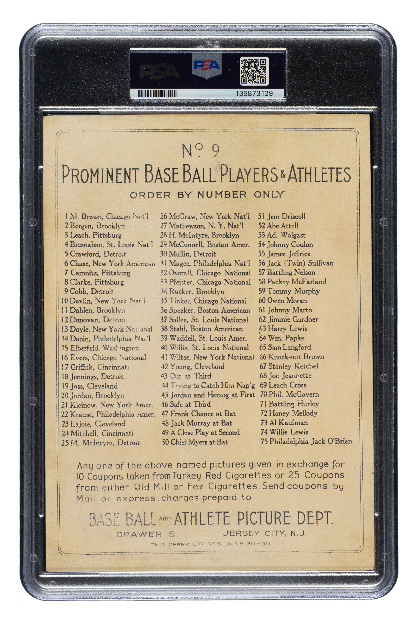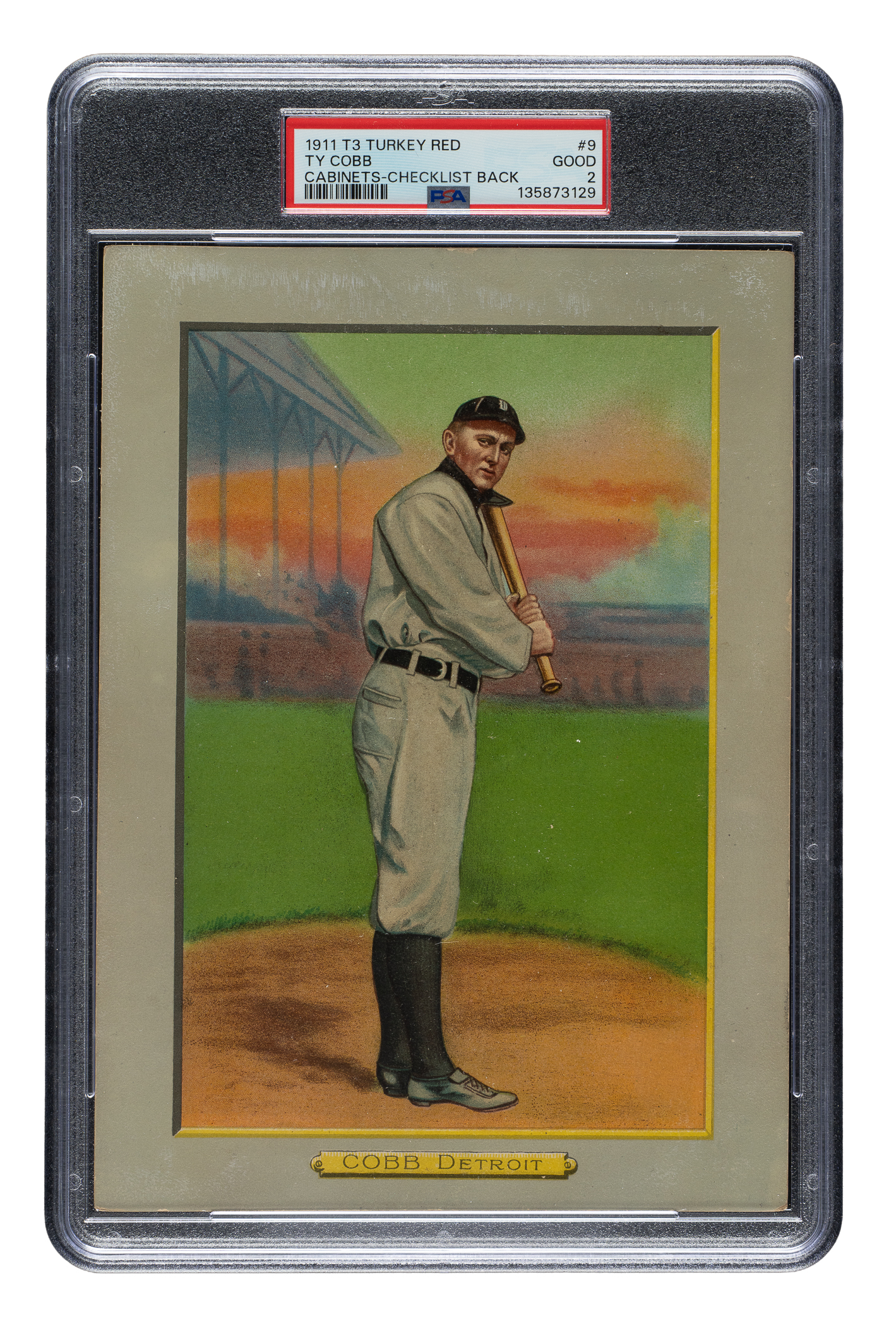 Graded GOOD 2 by PSA (submitted by REA). Presented is one of vintage-card collecting's most recognizable icons and the key card of the 1911 Turkey Red Tobacco cabinet-card series: #9 Ty Cobb. Besides being the most valuable card in the set, it is also one of the most desirable and striking of all Ty Cobb cards. This example is bright and crisp with brilliant colors and outstanding registration. The flaws include honest corner wear, a couple light creases on the top border, and faint paper remnants visible in the border areas. The checklist back (with offer) has evidence of album removal. The classic Turkey Red set is considered by many to be the most beautiful and well-made tobacco set ever issued. The T3 Ty Cobb has always and will always be in high demand, especially a modestly graded example which presents with strong eye appeal.