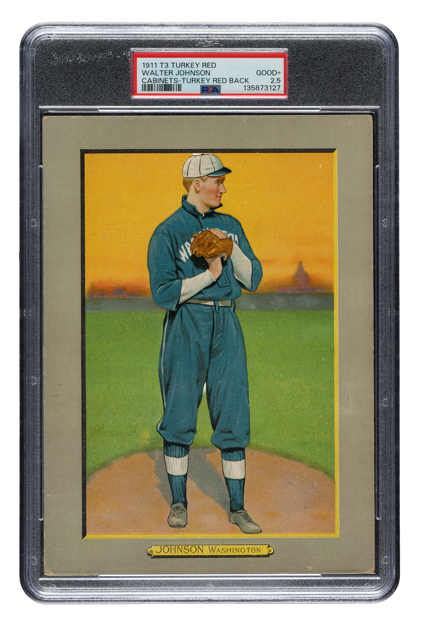 Graded GOOD+ 2.5 by PSA (submitted by REA). The T3 Turkey Red is one of Walter Johnson's most impressive and classic cards. Johnson, of course, is one of the key Hall of Famers in the Turkey Red set, which is universally recognized as one of the most substantial and beautiful sets ever produced. This example features bold colors, a crisp image, and honest corner wear. The reverse features the Turkey Red advertising back style (often considered more desirable among collectors). This is a very appealing example of one of the key cards of the era, which would make a tremendous addition to a high-quality Turkey Red set.