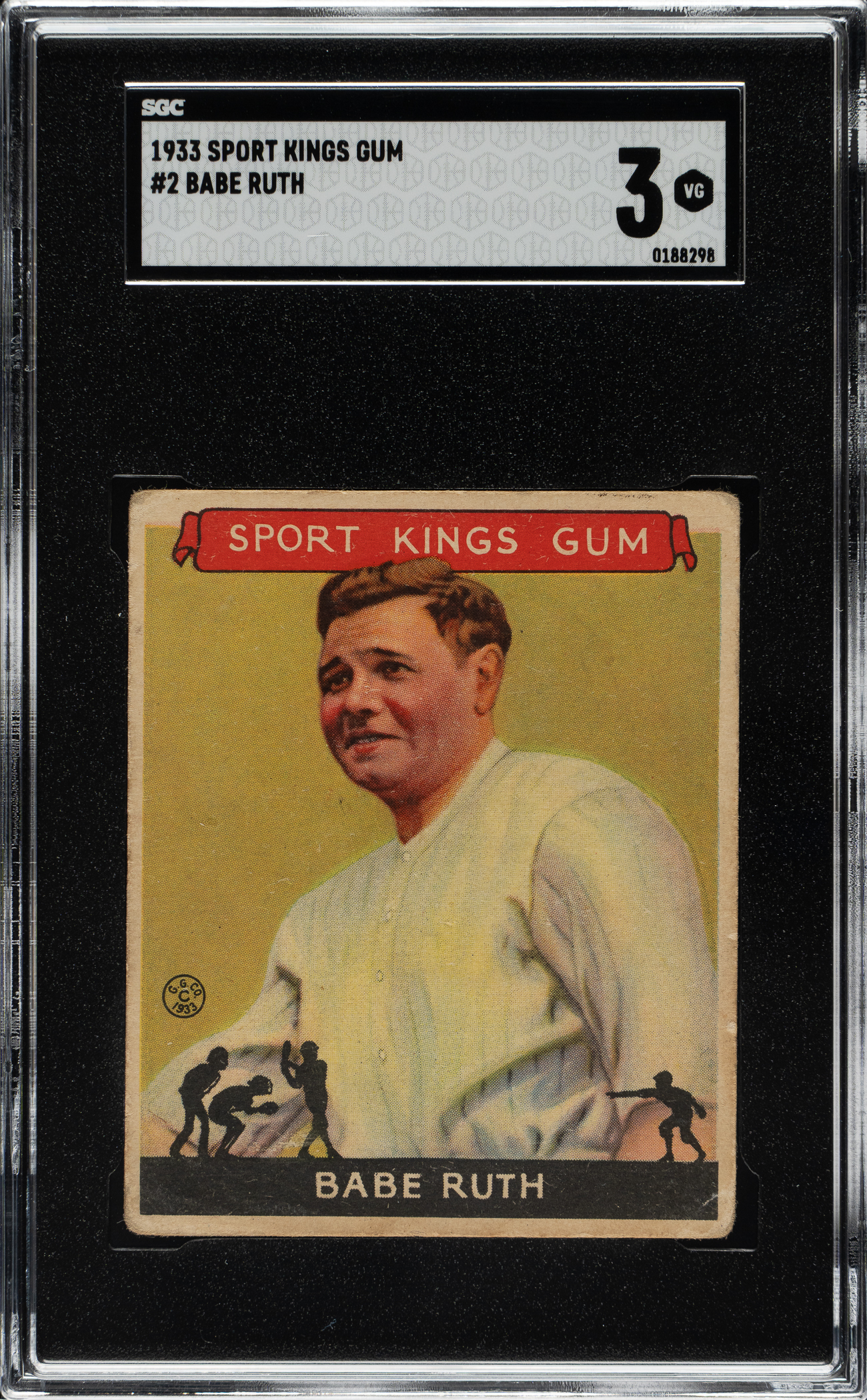 Graded VG 3 by SGC. Mid-grade example of one of the 1930s' classic cards. The R338 Sport King is one of Babe Ruth's most popular and desirable cards and one of the most famous and majestic cards in the collecting world. The 1933 Sport Kings Ruth is far rarer than Ruth's 1933 Goudey counterparts. The offered example is bold and crisp, with honest corner wear, and a few light unobtrusive creases. This is a pleasing example of this classic Babe Ruth card.