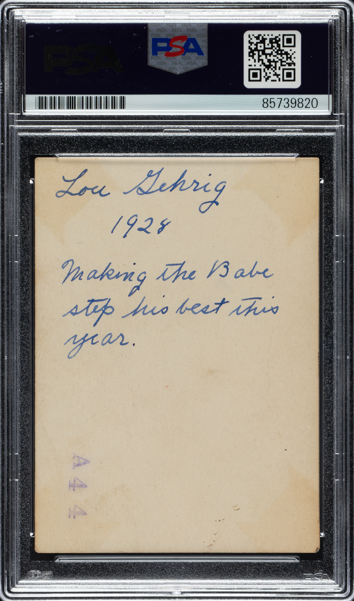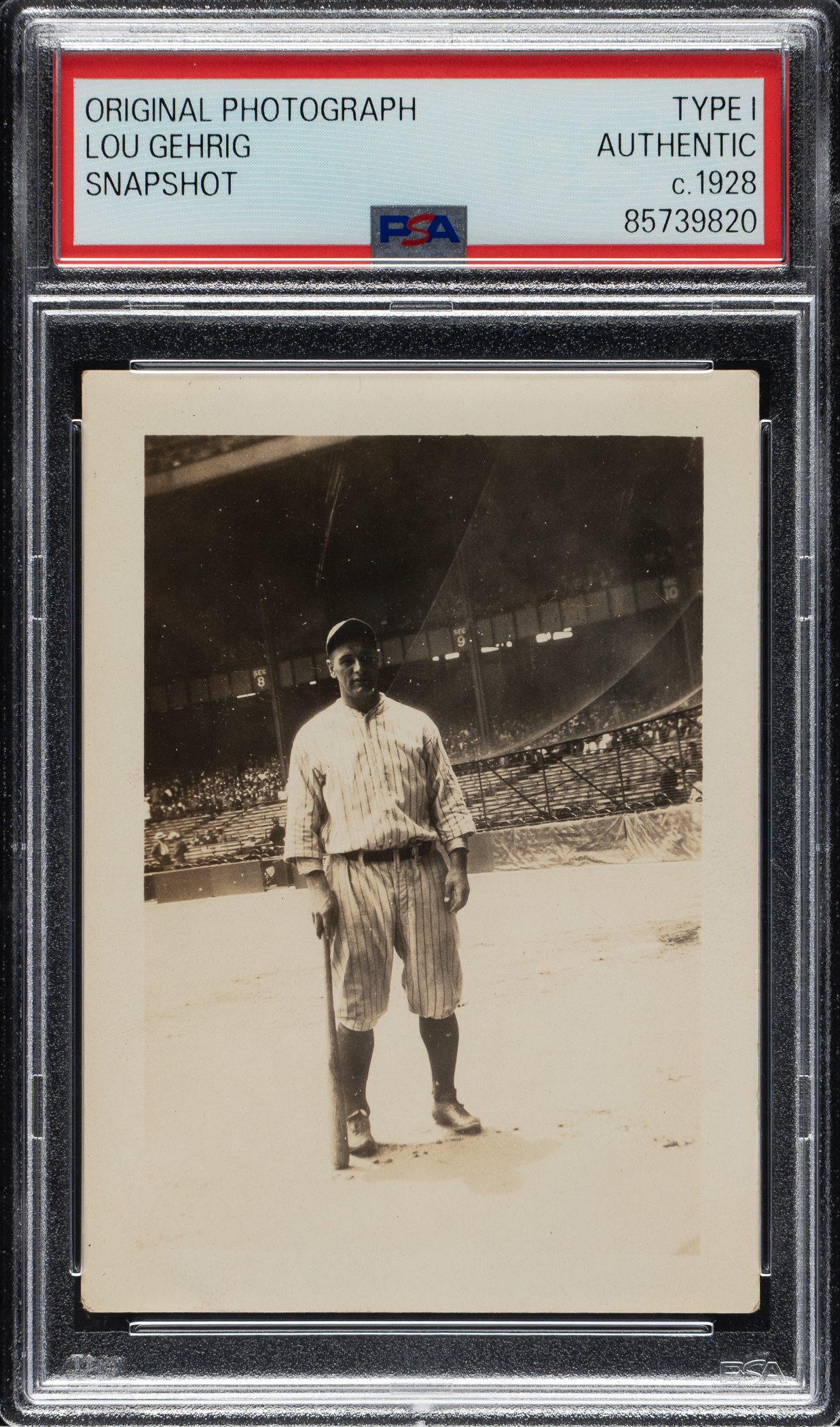 Presented is a original snapshot-photograph of New York Yankees Hall of Fame first baseman Lou Gehrig, circa 1928. Encapsulated and certified as an original Type I photograph by PSA/DNA. The black-and-white photograph shows Gehrig in uniform with the grandstands in the background. The reverse displays a stamp and blue ink notations that read "Lou Gehrig/1928/Making the Babe step his best this year." The photo (2.5 x 3.5 inches), which has exceptional image quality, has light creases and corner-mount marks on the reverse. In Very Good condition overall.