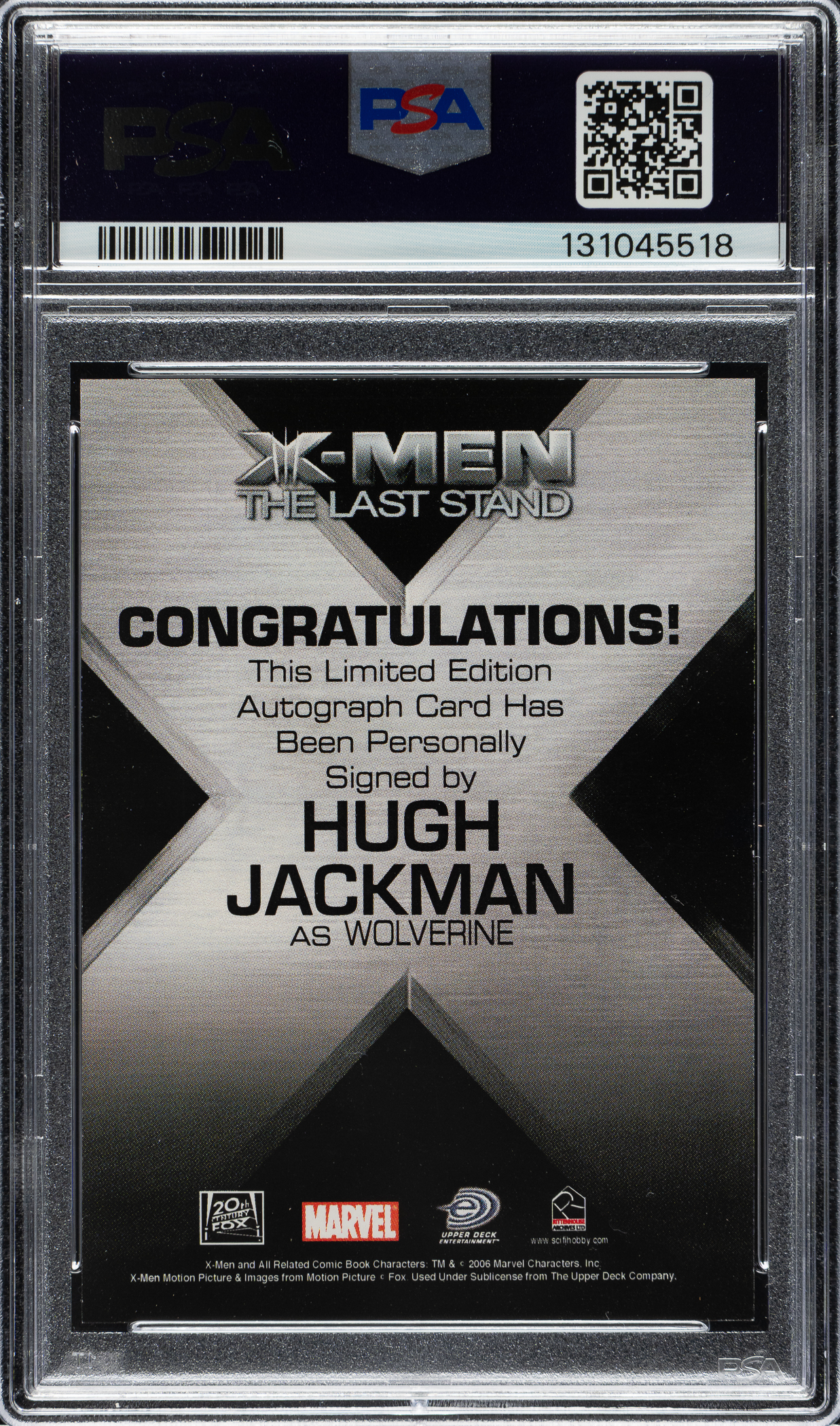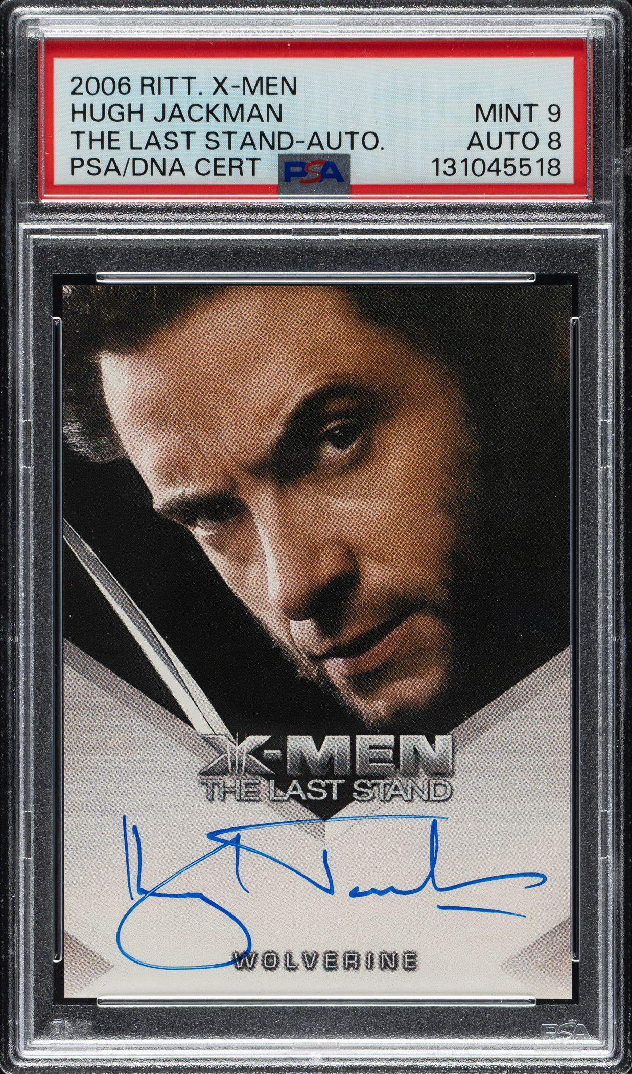 PSA/DNA has encapsulated the card, grading the signature GEM MINT 10 and the card MINT 9. Hugh Jackman as Wolverine in the critically acclaimed X-Men films.