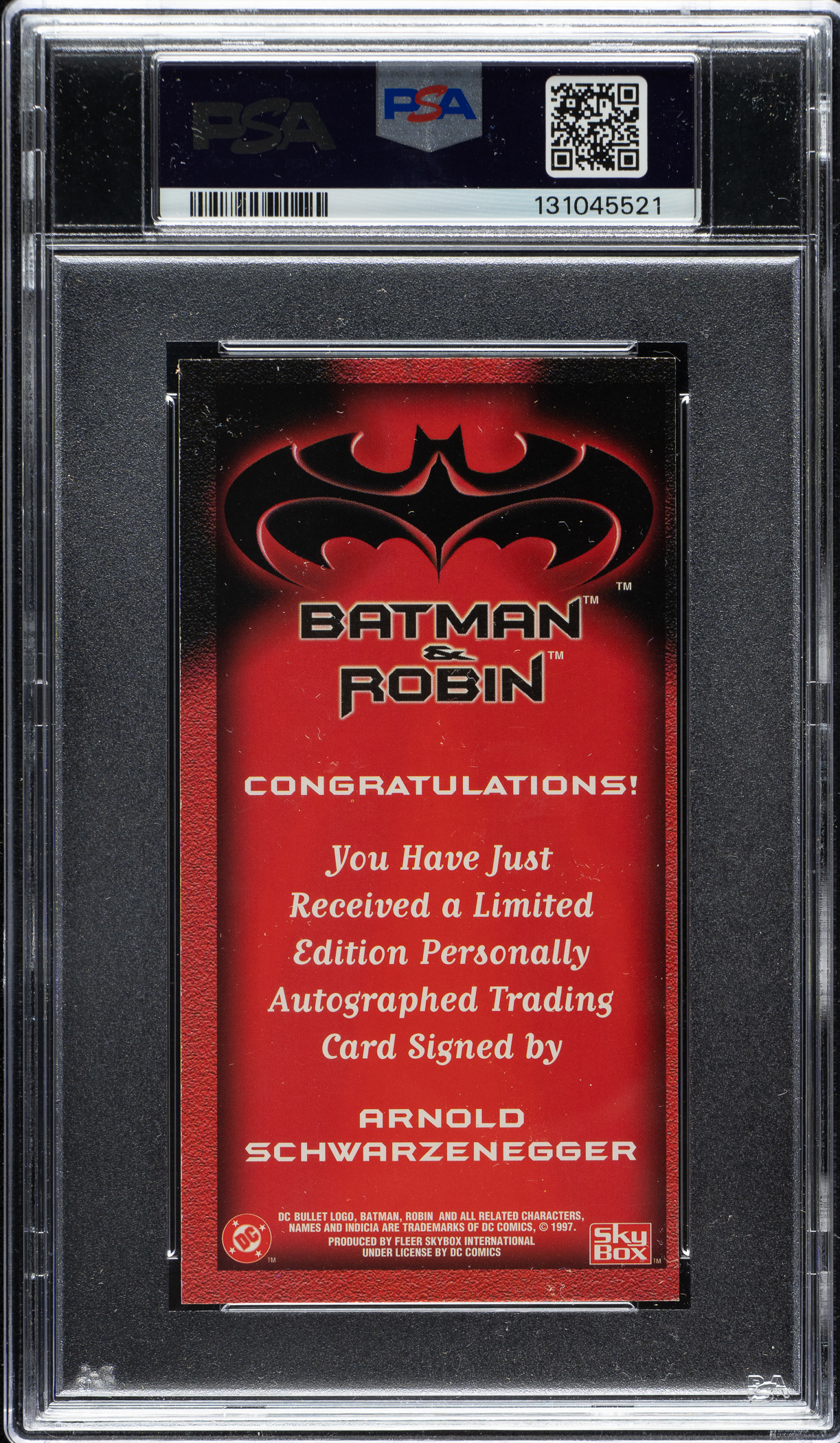 PSA/DNA has encapsulated the card, grading both the signature and card NM-MT 8. Arnold Schwarzenegger as Mr. Freeze in the 1997 movie Batman & Robin.