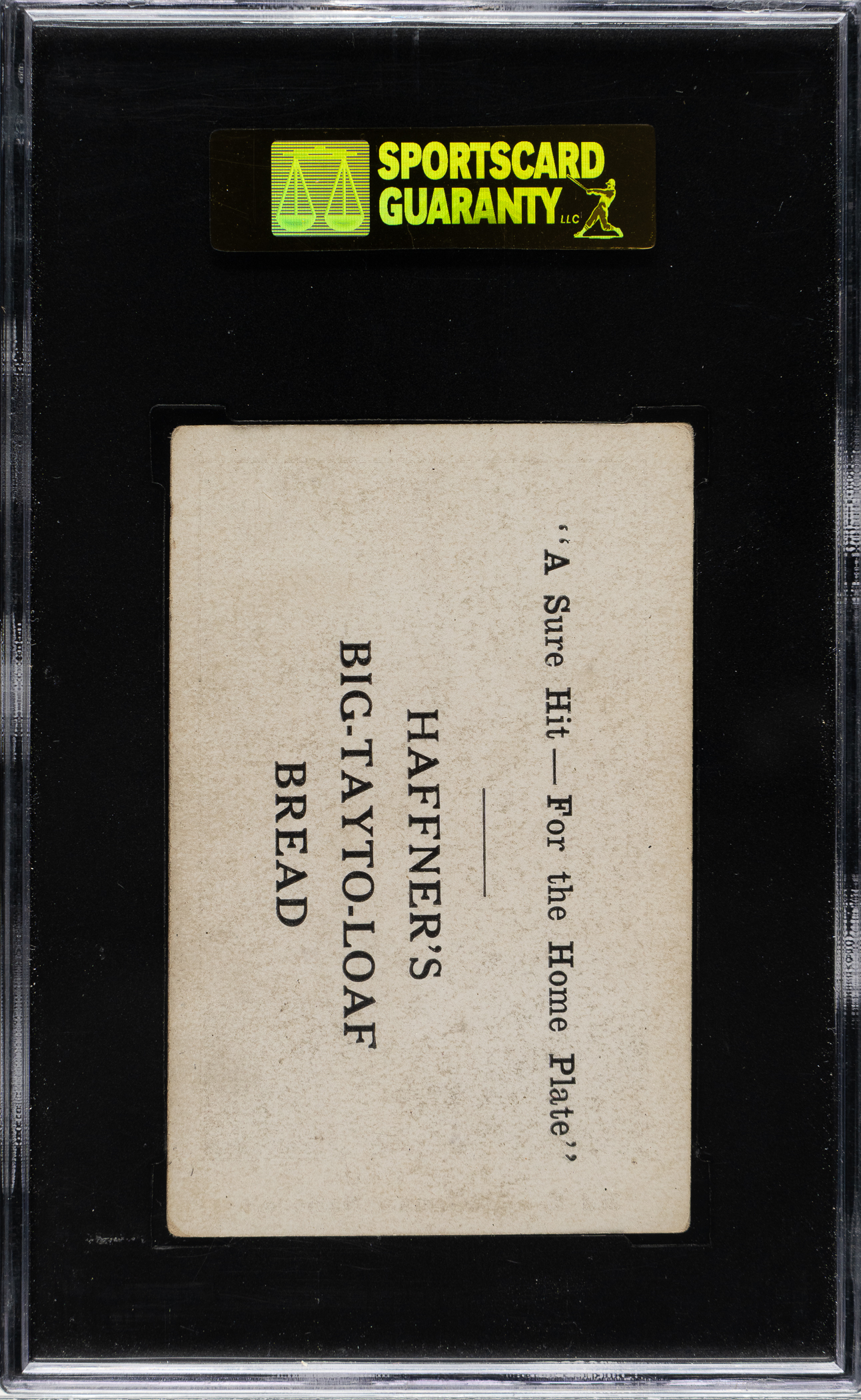 Graded VG/EX 50 by SGC. Extremely scarce sample card of Heinie Groh (Cincinnati Reds) from the 1922 Haffner’s Bread set. This is the ONLY Heinie Groh card with this back ever graded by SGC! Haffner's's Bread cards share the same fronts with W575-1 strip cards, which are blank-backed. Several bakeries used W575-1s as promotional vehicles, including Gassler, Clark, and Haffner, each of which is particularly rare. The W575-1 set is very similar in nature to the American Caramel Company E121 issue as both sets feature the same design and likenesses for many of the players included. This is a remarkable sample, only the second of its kind that we can recall ever offering. Centered slightly to the right with a strong image and even wear to the corners. The Haffner’s Bread advertising reverse is boldly printed, which is the ideal for a rare advertising back. A rarely seen Haffner’s Bread example that would be an outstanding addition to any sample-card or Cincinnati Reds collection.