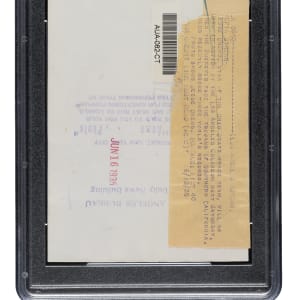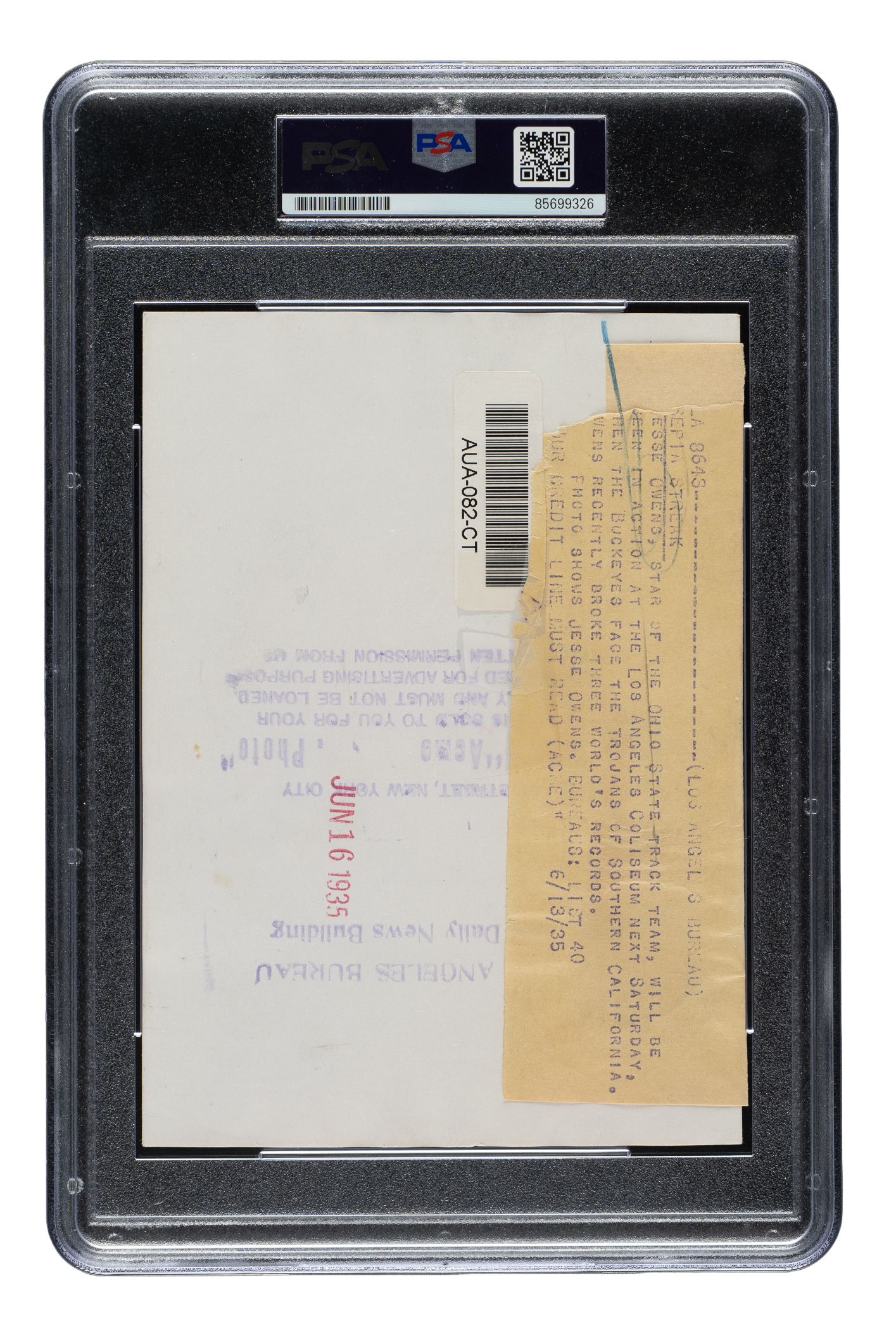 Original photo of legendary sprinter Jesse Owens in 1935. Encapsulated and certified as an original Type I photograph by PSA/DNA. The portrait image captures Owens as a member of the Ohio State University track and field team in uniform. The bears an "ACME Newspictures Inc." credit stamp, the original paper news caption, and a Jun 16, 1935," credit stamp. The photo (5 x 7 inches) displays light creasing and a patch of age-related yellowing along Owen's uniform. Very Good condition overall.