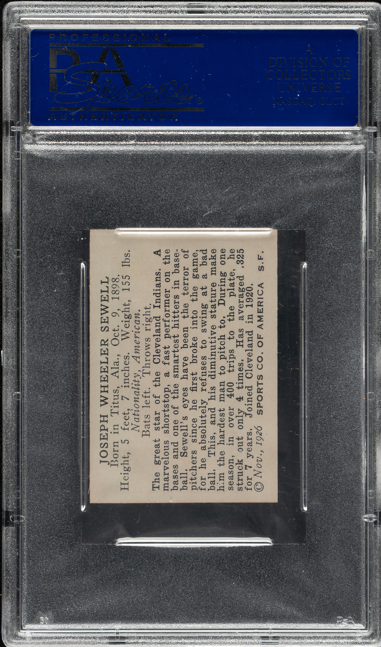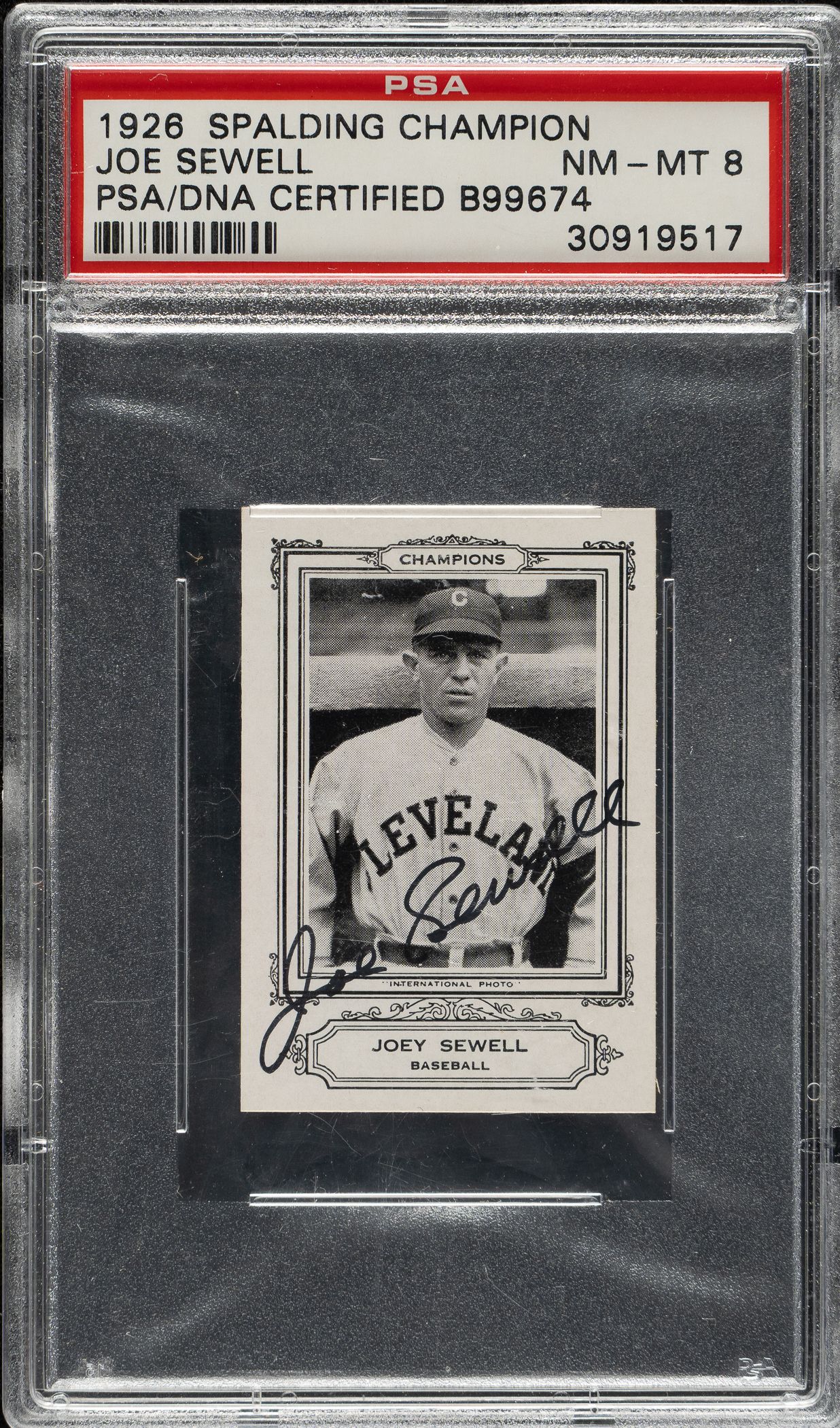PSA/DNA has encapsulated the card, grading the signature Authentic and the card NM-MT 8. Cleveland Indians Hall of Famer Joe Sewell.