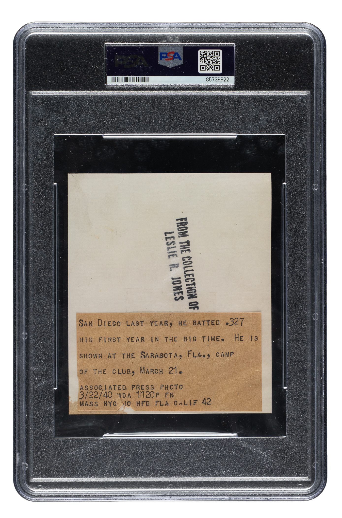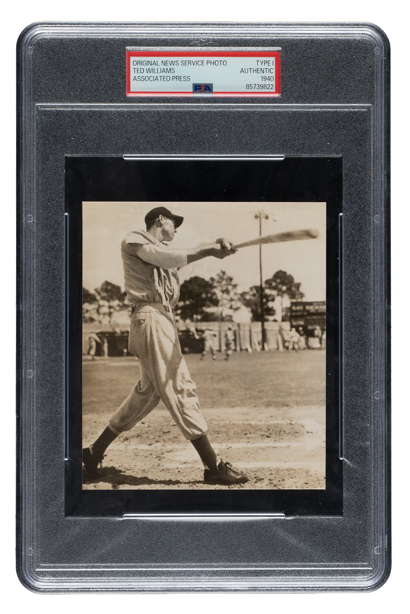 Original news photo capturing Ted Williams as a member of the Boston Red Sox during spring training in 1940. Encapsulated and certified as an original Type I photograph by PSA/DNA. Williams is captured at the plate in a swing-through pose. The reverse features the original "Associated Press" news caption and a collector's stamp. The photo, which has been trimmed to its current dimensions of 4.25 x 5 inches, displays rippling throughout and a crease in the upper right. Good to Very Good condition overall.