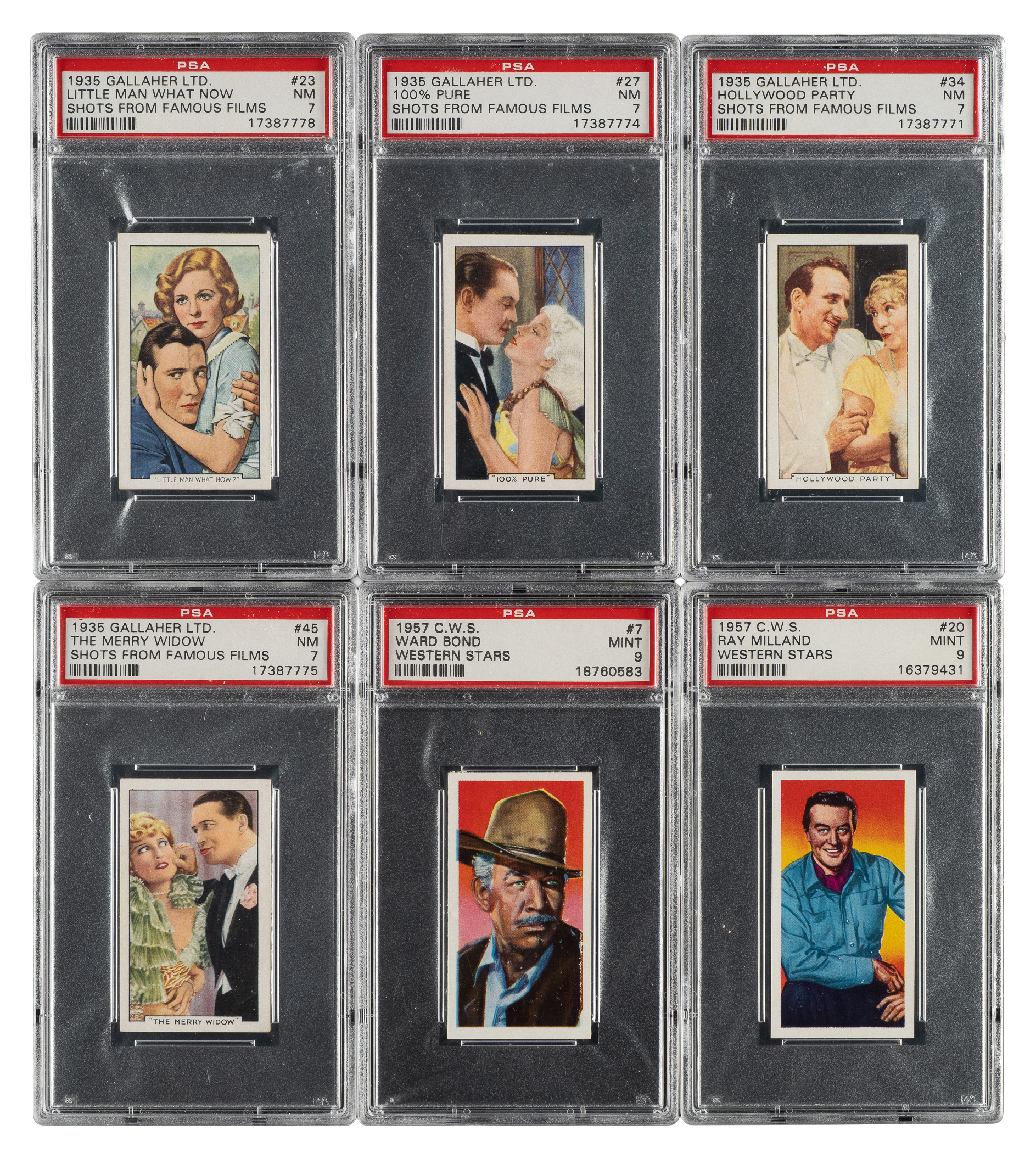 Collection of six 1935 and 1957 Gallaher Ltd. Shots from Famous Films and C.W.S. "Western Stars" cards, each graded and encapsulated by PSA. This collection consists of the following: 1) 1935 Gallaher Ltd. Shots from Famous Films (4 cards): #23 (NM 7), 27 (NM 7), 34 (NM 7), and 45 (NM 7). 2) 1957 C.W.S. "Western Stars" (2 cards): #7 (MINT 9) and 20 (MINT 9). Total 6 cards.