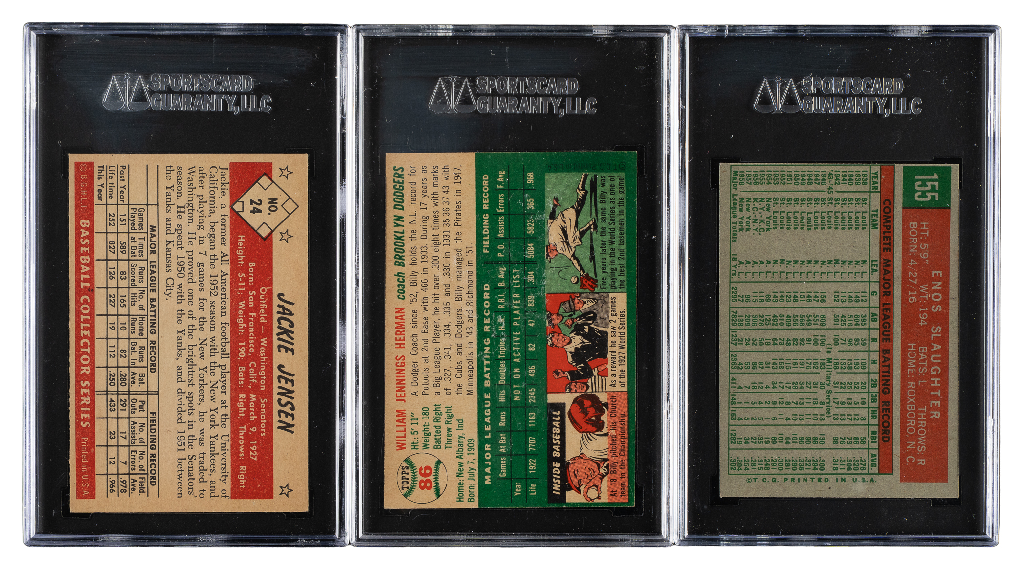 Trio of 1953 to 1959 Topps and Bowman cards, featuring New York Yankees Hall of Famer Enos Slaughter. Each card has been graded and encapsulated NM 84 by SGC. This trio consists of the following: 1) 1953 Bowman Color #24 Jackie Jensen. 2) 1954 Topps #86 Billy Herman. 3) 1959 Topps #155 Enos Slaughter. Total: 3 cards.