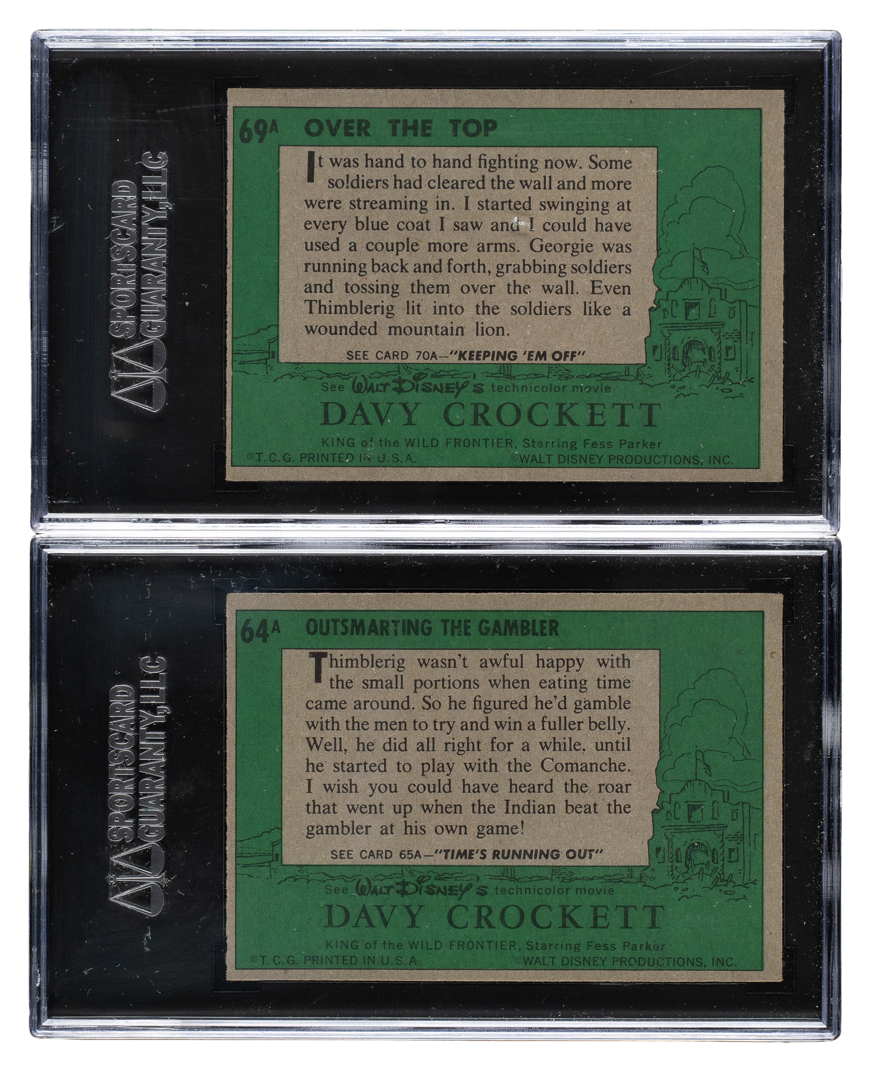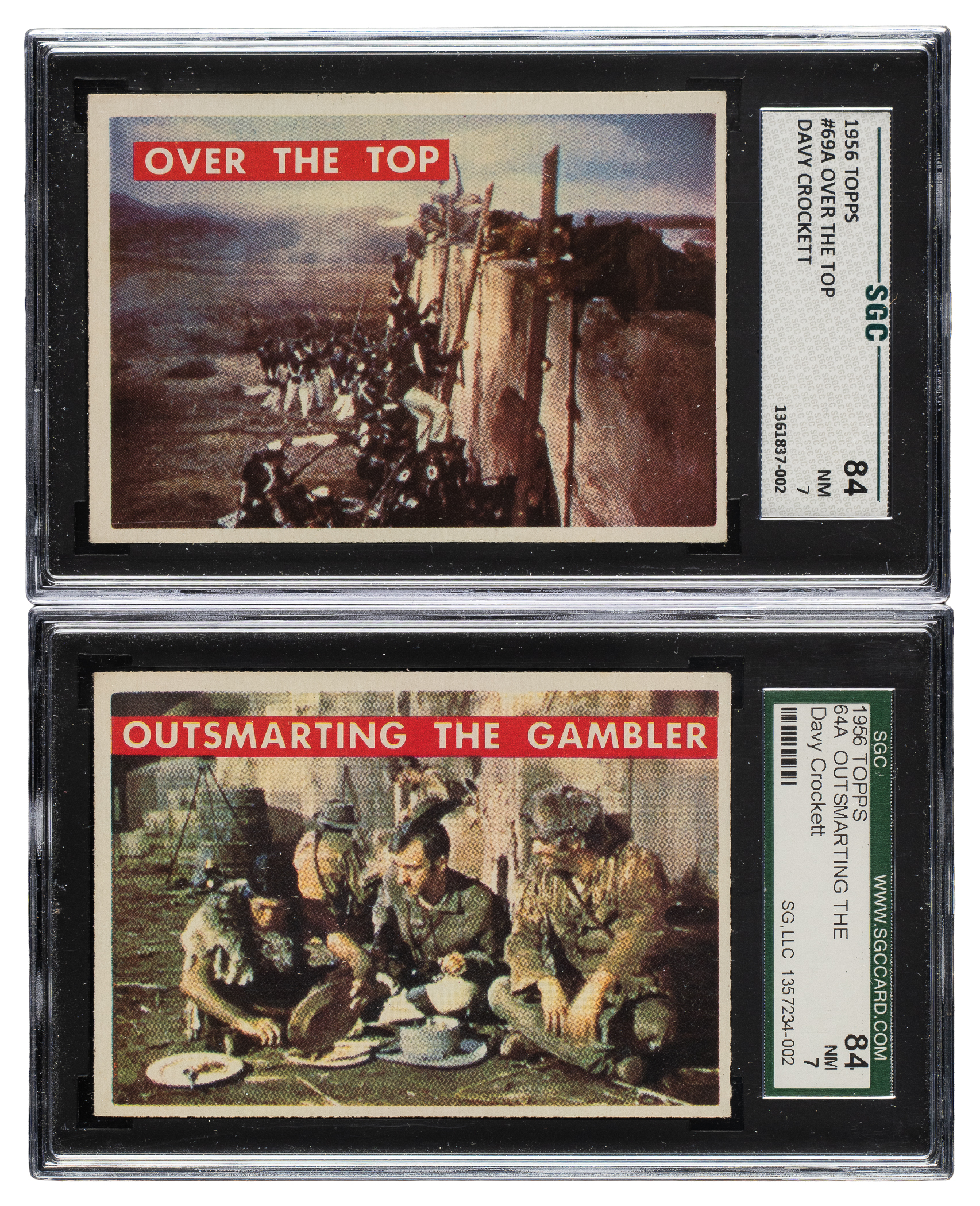 Pair of 1956 Topps "Davy Crockett" cards, both graded and encapsulated NM 84 by SGC. This pair consists of the following: #64A Outsmarting the Gambler and 69A Over the Top. Total: 2 cards.