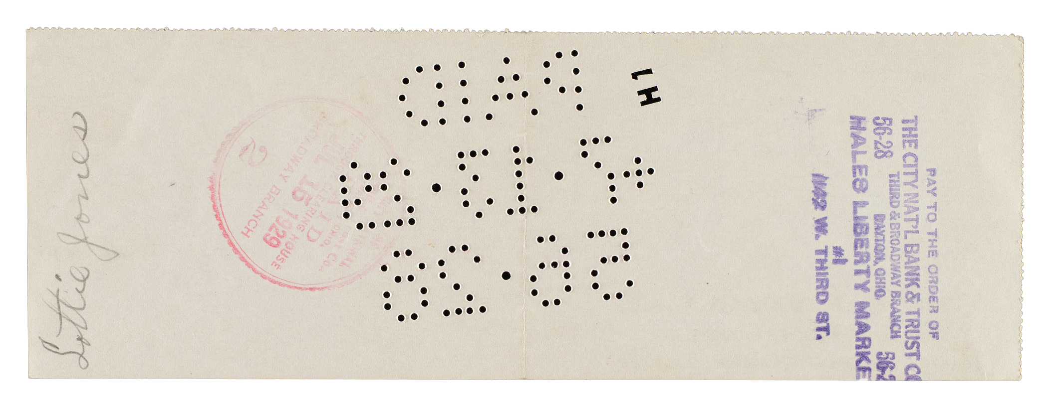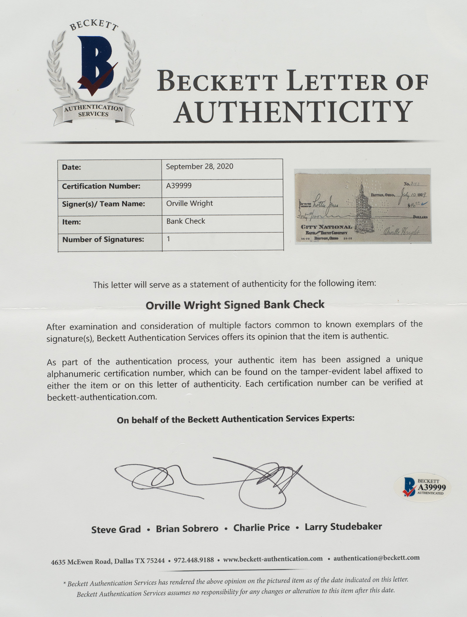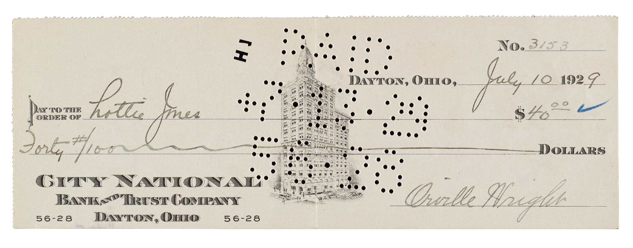 Bank check dated July 10, 1929, and signed by Orville Wright (1871-1948), in black fountain pen. The check, drawn on the City National Bank and Trust Company of Dayton, Ohio, is made out to "Lattie Jones" for $40.00. Brothers Orville and Wilbur Wright built and flew the first manned, motor-powered heavier-than-air craft. The first flight, with Orville at the controls, took place at Kitty Hawk, North Carolina, on December 17, 1903. The success of that flight paved the way for the development of larger and heavier planes shortly after. The check (8-3/4 x 3-1/8 inches) has normal bank cancellation stamps and perforations (not affecting the signature), as well as a vertical fold and minor wrinkles. In Very Good to Excellent condition overall. Full LOA from Beckett.