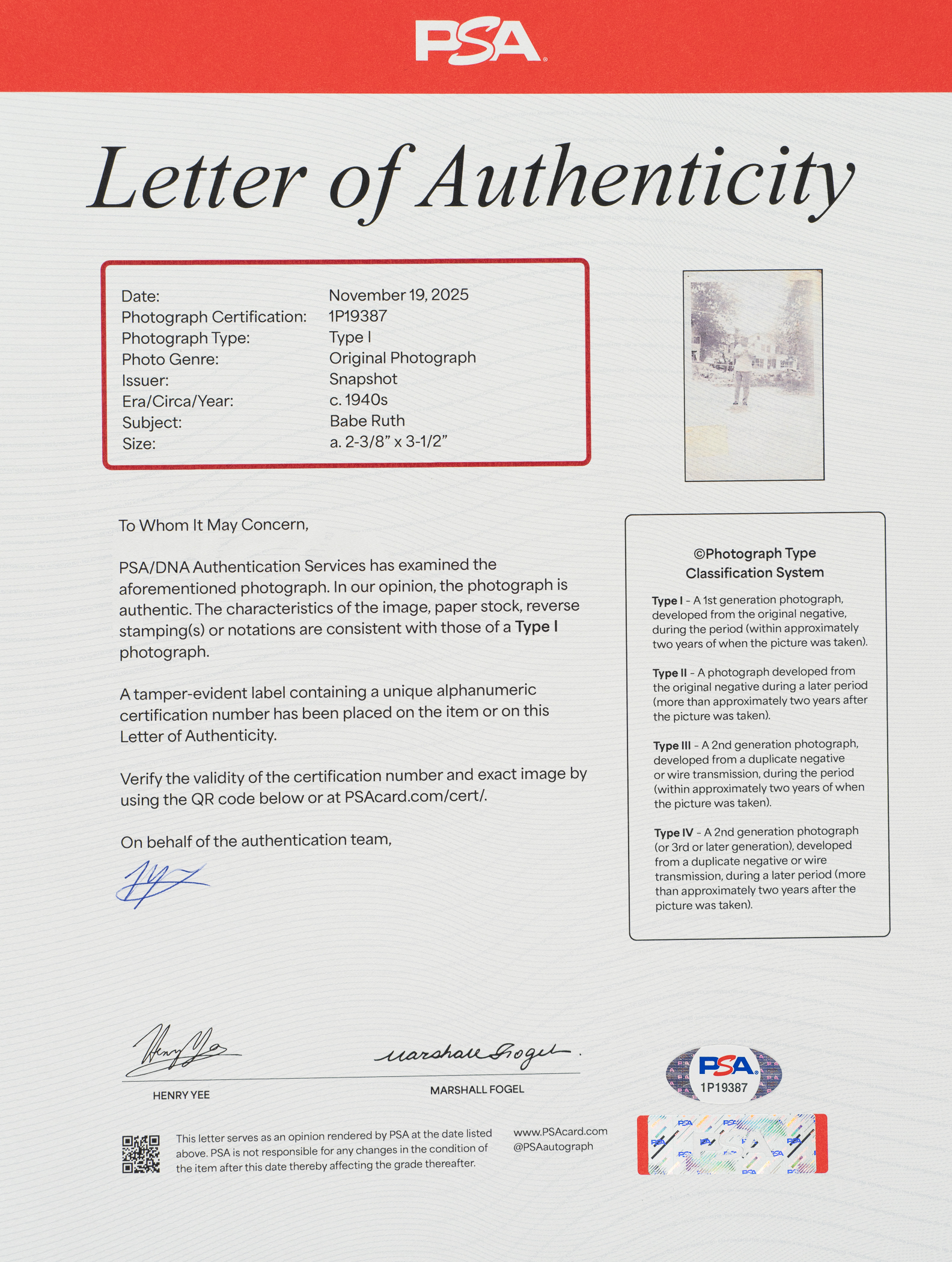PSA/DNA has certified the signature as an original Type I photograph. New York Yankees Hall of Famer Babe Ruth.