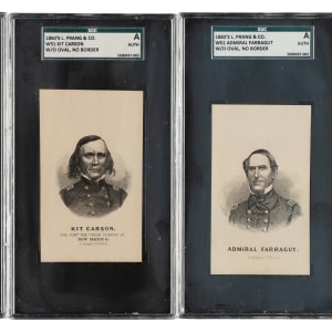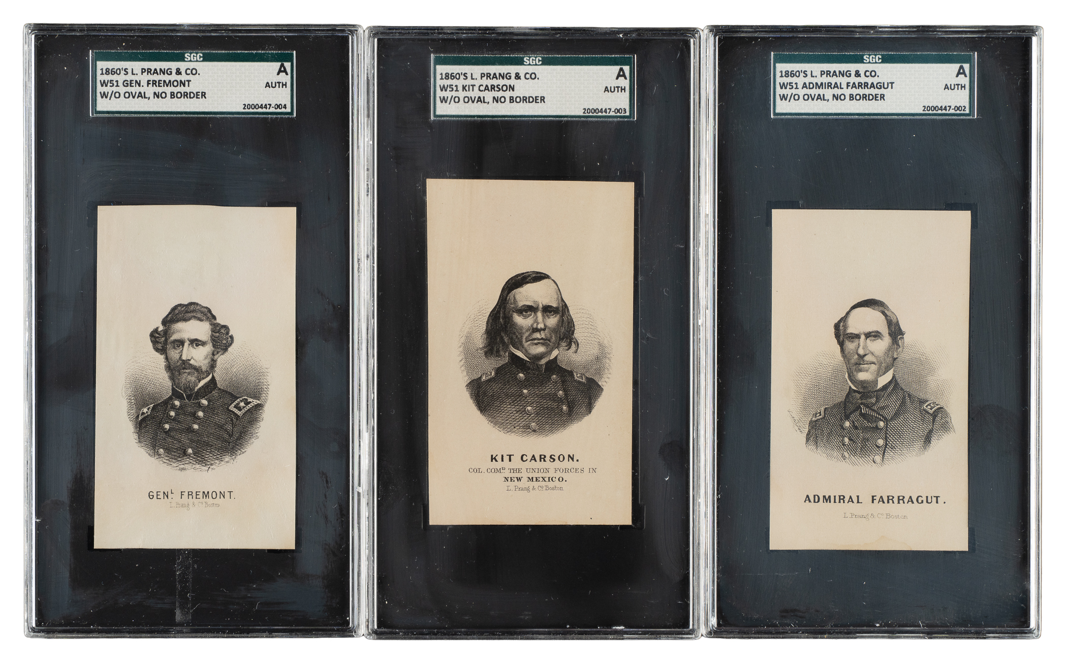 Trio of Circa 1860s W51 L. Prang & Co. cards, each graded and encapsulated Authentic by SGC. This trio consists of the following: Kit Carson (without oval, no border) Admiral Farragut (without oval, no border), and Gen. Fremont (without oval, no border). Total: 3 cards.