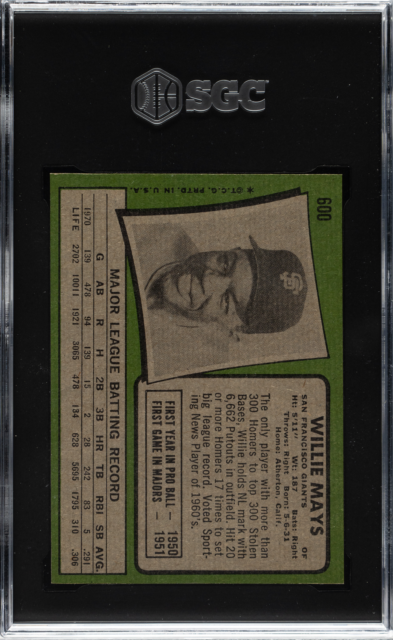 Graded MINT 9 by SGC. Stunning high-grade example of San Francisco Giants Hall of Famer Willie Mays from the 1971 Topps set. This set is naturally prone to many different problems, including centering issues, print quality, and especially corner and edge chipping. Bright, crisp, and clean with four sharp corners and perfectly clean borders. Clean reverse. This is a striking high-grade example of Willie Mays from one of the most condition-sensitive sets ever produced.
