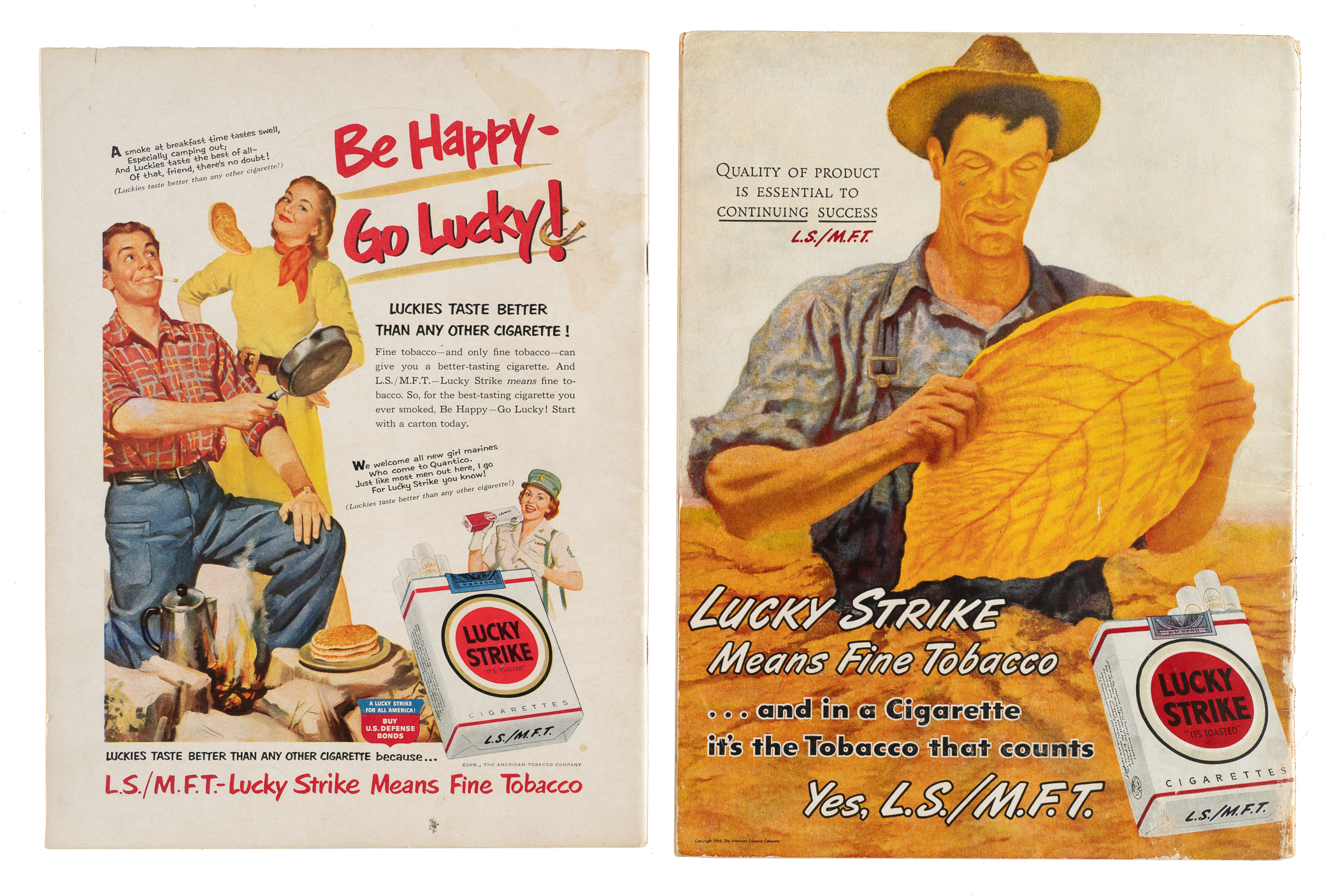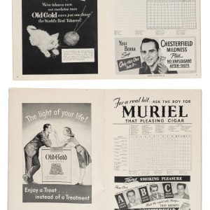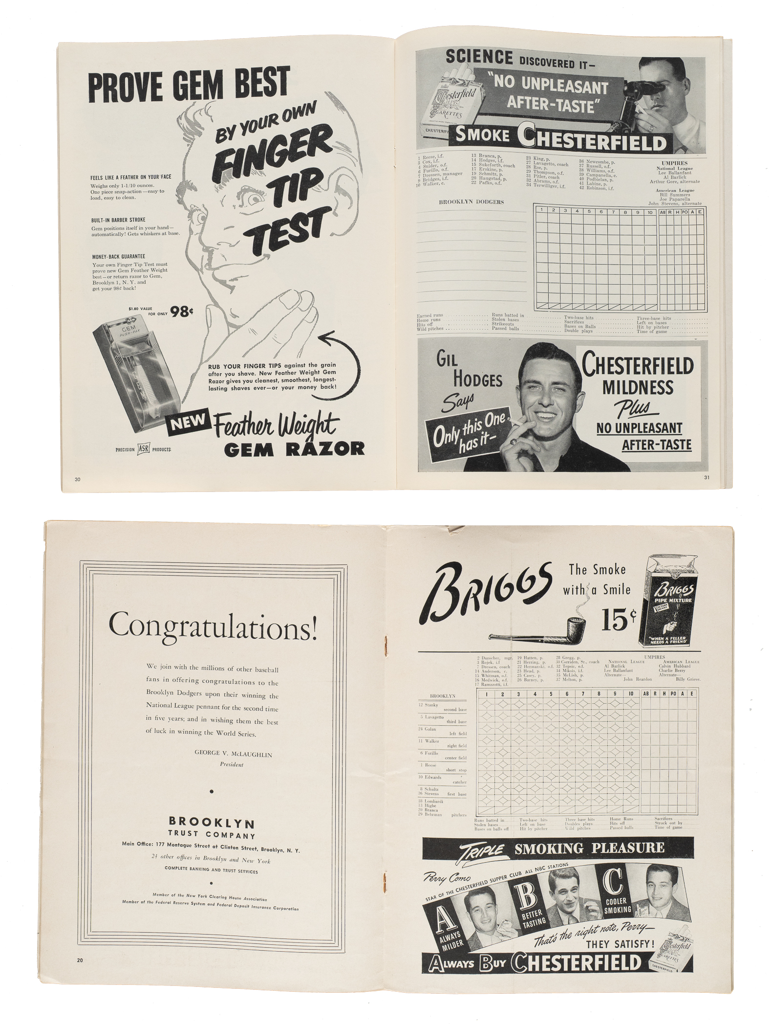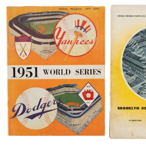 Two phantom World Series programs, produced in anticipation of the Dodgers' winning the National League pennant in 1946 and 1951. In 1946 and 1951 the Brooklyn Dodgers neared October with legitimate hopes of continuing to World Series play. We now know, of course, that in the eleventh hour in both of those seasons the Dodgers conceded the pennant to the Cardinals and the Giants, respectively. For both of those pennant races the necessary lead-time to produce Dodger World Series programs required the actual production of the World Series programs in anticipation of victory. The production run of each was destroyed when the Dodgers did not actually win the pennant, but a few examples escaped and were saved as souvenirs by those related to the team and the printers. These two examples are among the most sought-after of all phantom programs. Very few of these programs, each from a "World Series that never was," have survived as reminders of lost opportunity, and the heartache that was often experienced by loyal Brooklyn fans in the 1940s and 1950s. The 1946 program is in Good condition, with moderate handling wear to the covers, including a few creases, light staining, minor discoloration, and tears along the spine. The 1951 program is in Very Good condition, with minor edge tears and a small area of light discoloration on the back cover. Total: 2 programs.