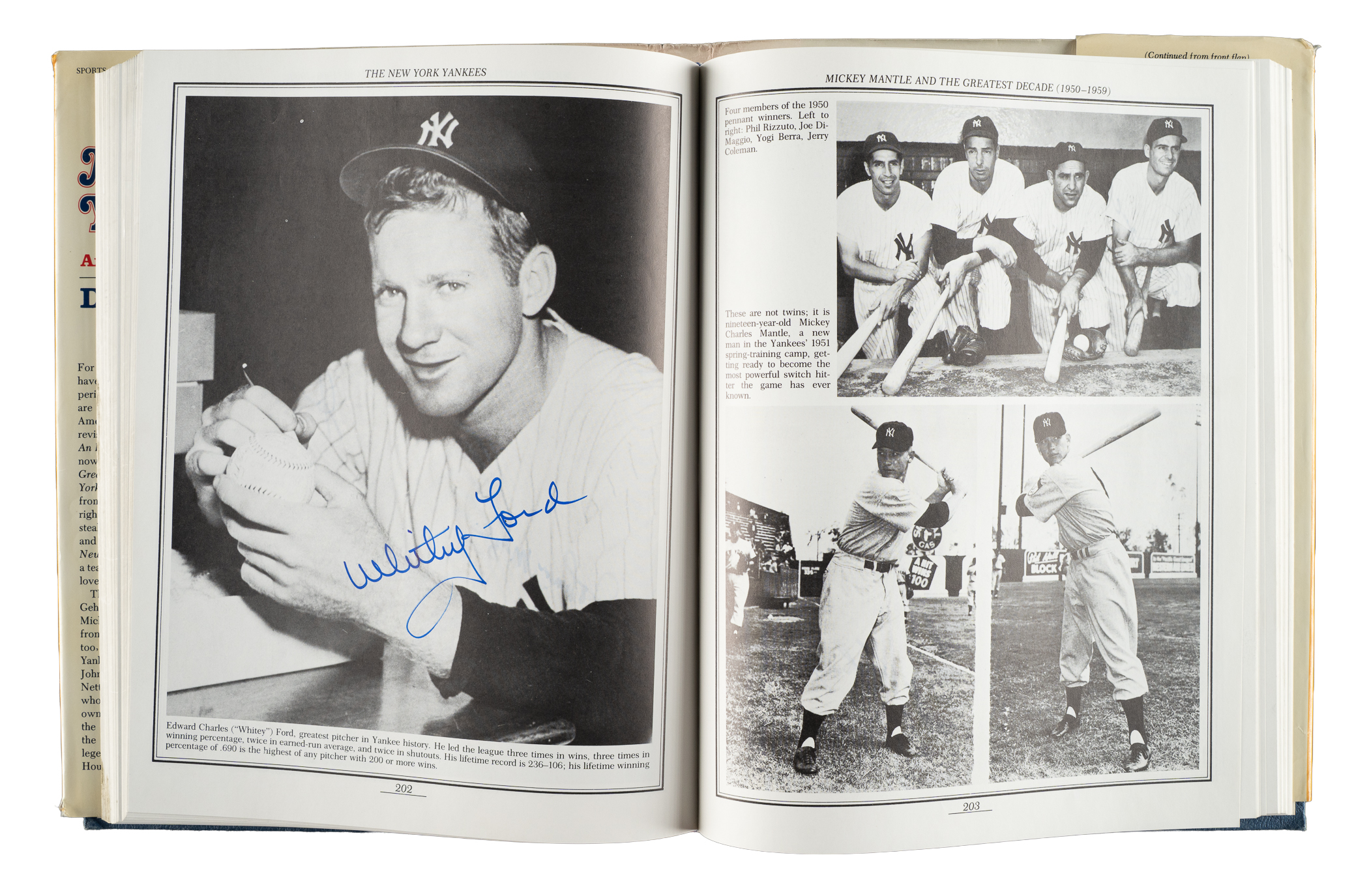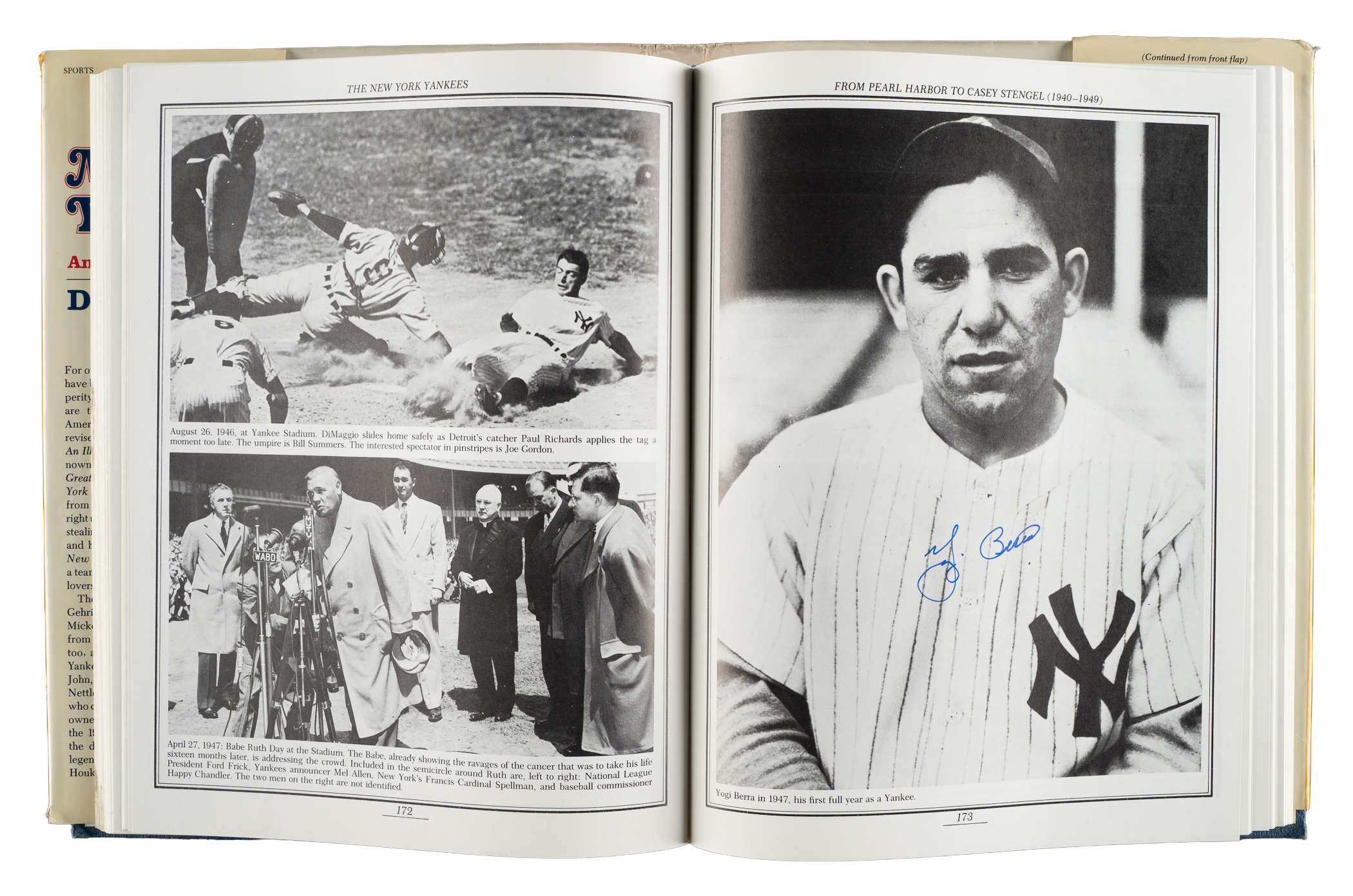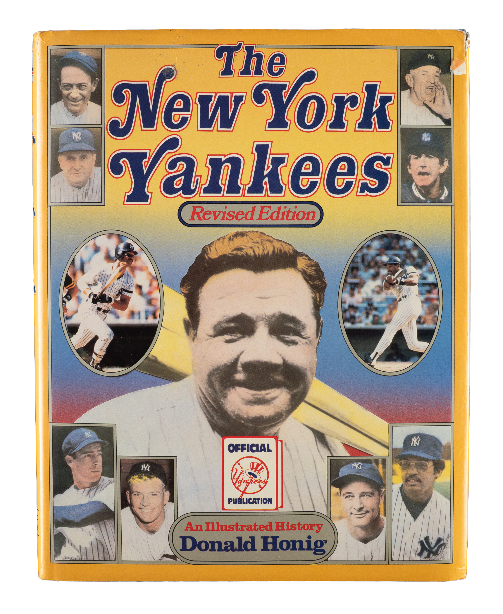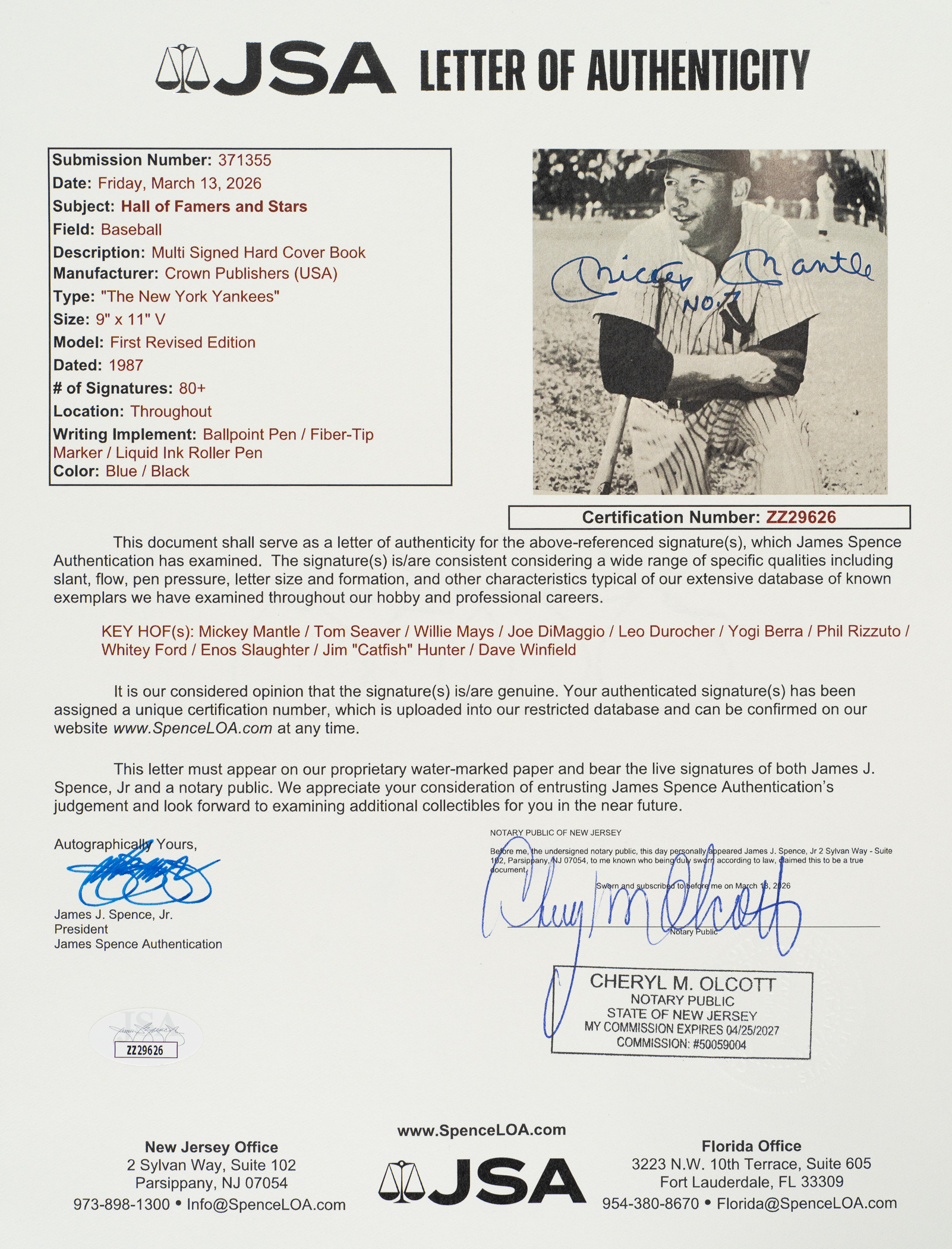 1987 The New York Yankees: An Illustrated History (Revised Edition) by Donald Honig featuring eighty-plus signatures (with some players having signed multiple times) on either the inside cover or interior. Notable signees include Joe DiMaggio (pg. 124), Yogi Berra (pg. 173), Phil Rizzuto (pgs. 161, 196 with personalized inscription, and 213), Mel Allen (pg. 168), Bob Feller (pg. 169 with personalized inscription), Johnny Mize (pgs. 201 and 212), Whitey Ford (pg. 202), Willie Mays (pg. 206), Leo Durocher (pg. 206), Mickey Mantle (pg. 220, with "No. 7" inscription), Tom Seaver (pg. 259), Bob Lemon (pg. 272), Catfish Hunter (pg. 277), and Dave Winfield (pg. 314). Crown Publishers, New York, 1987. The hardbound book (8-5/8 x 11-1/8 inches) displays light to moderate handling wear along with some small tears and spots of staining along the original dust jacket; Very Good to Excellent condition overall. Full LOA from James Spence/JSA.