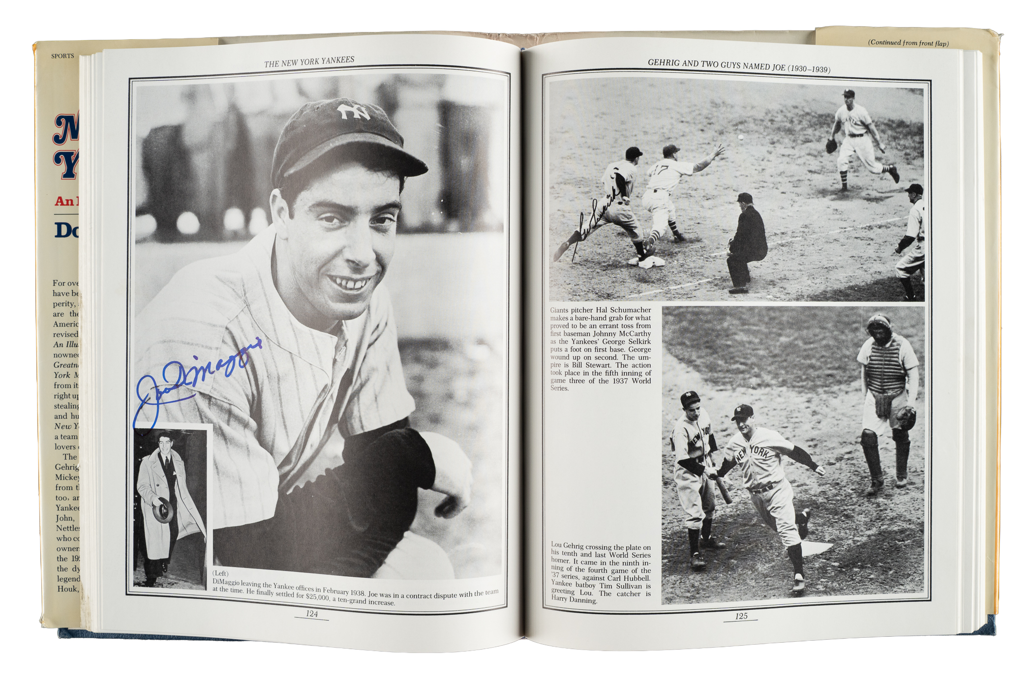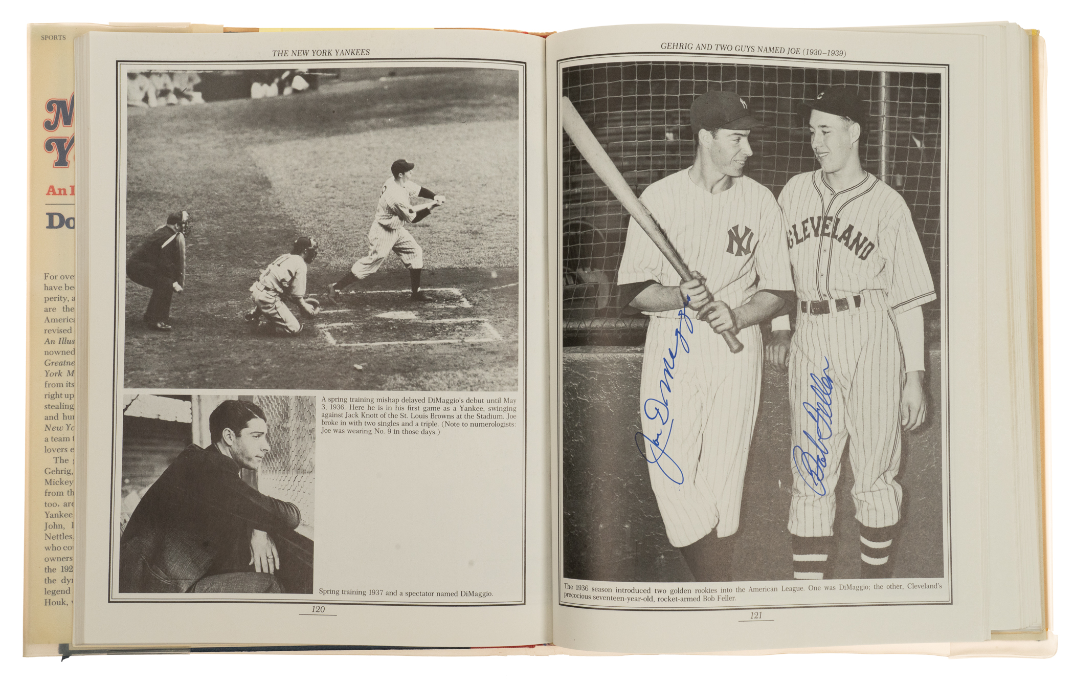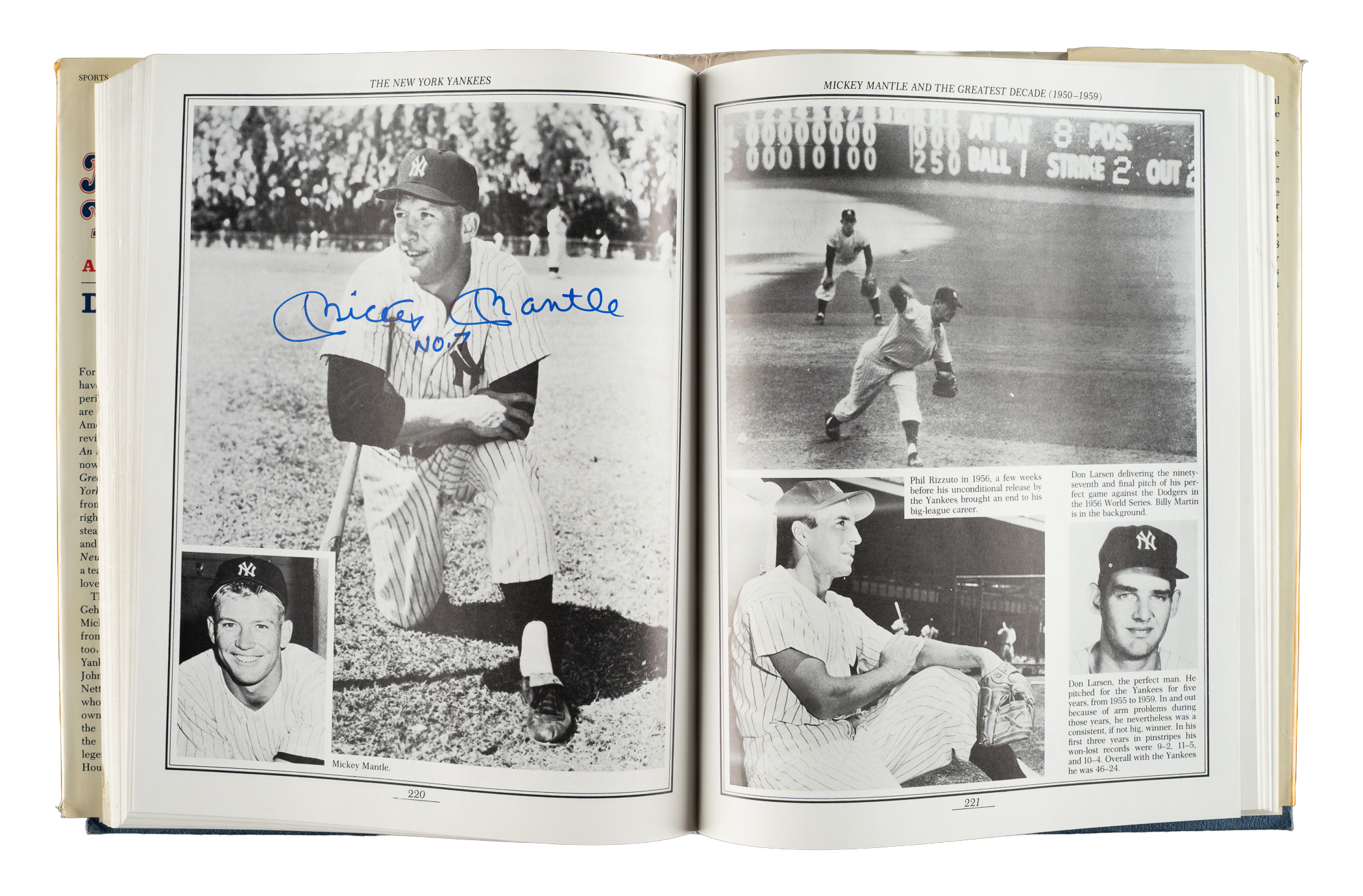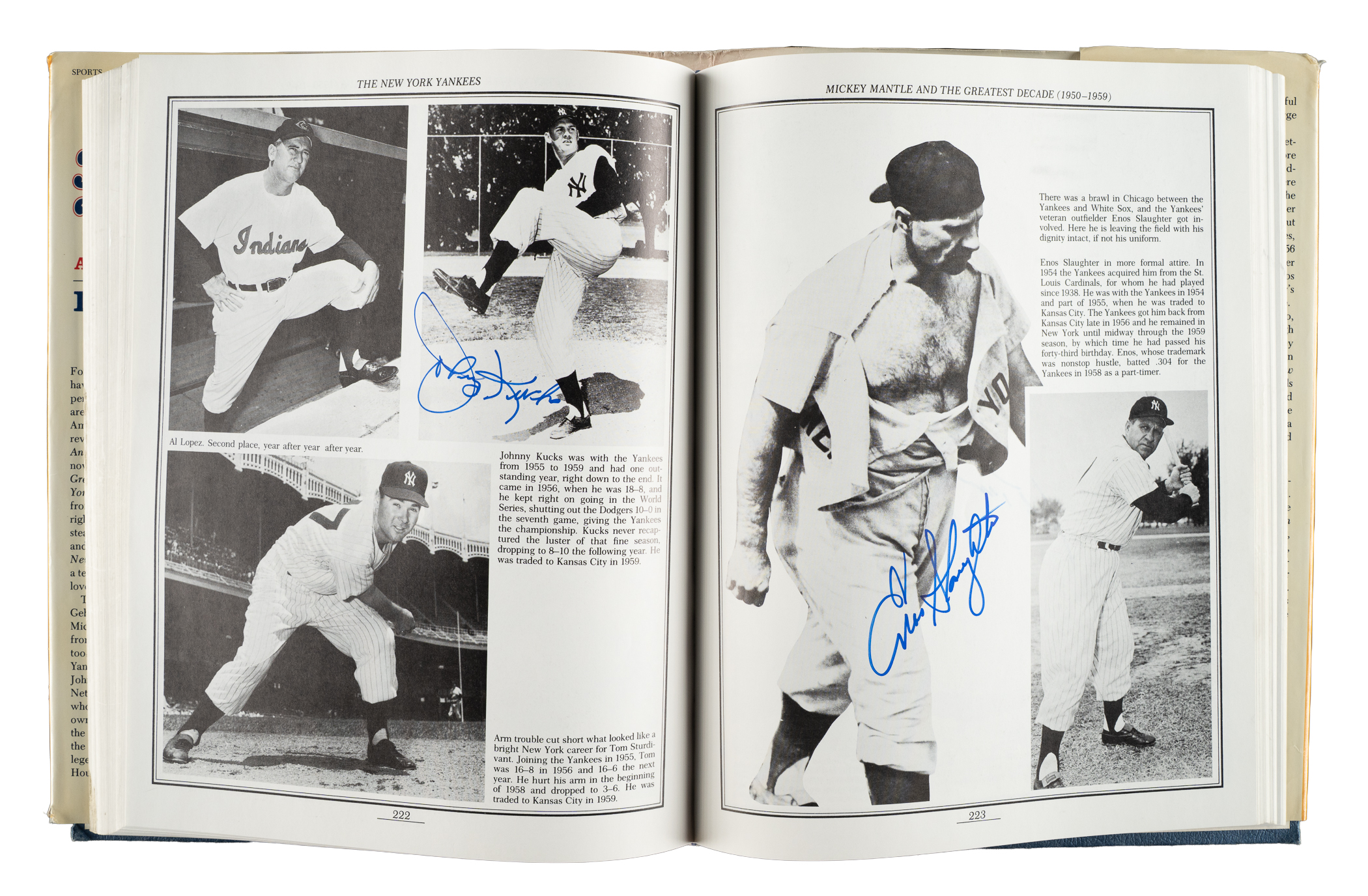 1987 The New York Yankees: An Illustrated History (Revised Edition) by Donald Honig featuring eighty-plus signatures (with some players having signed multiple times) on either the inside cover or interior. Notable signees include Joe DiMaggio (pg. 124), Yogi Berra (pg. 173), Phil Rizzuto (pgs. 161, 196 with personalized inscription, and 213), Mel Allen (pg. 168), Bob Feller (pg. 169 with personalized inscription), Johnny Mize (pgs. 201 and 212), Whitey Ford (pg. 202), Willie Mays (pg. 206), Leo Durocher (pg. 206), Mickey Mantle (pg. 220, with "No. 7" inscription), Tom Seaver (pg. 259), Bob Lemon (pg. 272), Catfish Hunter (pg. 277), and Dave Winfield (pg. 314). Crown Publishers, New York, 1987. The hardbound book (8-5/8 x 11-1/8 inches) displays light to moderate handling wear along with some small tears and spots of staining along the original dust jacket; Very Good to Excellent condition overall. Full LOA from James Spence/JSA.